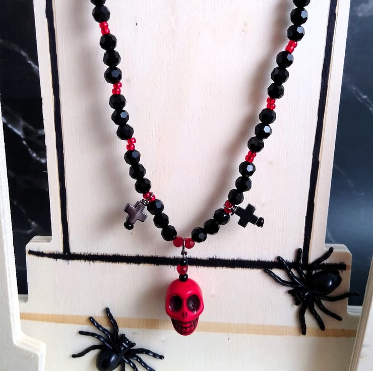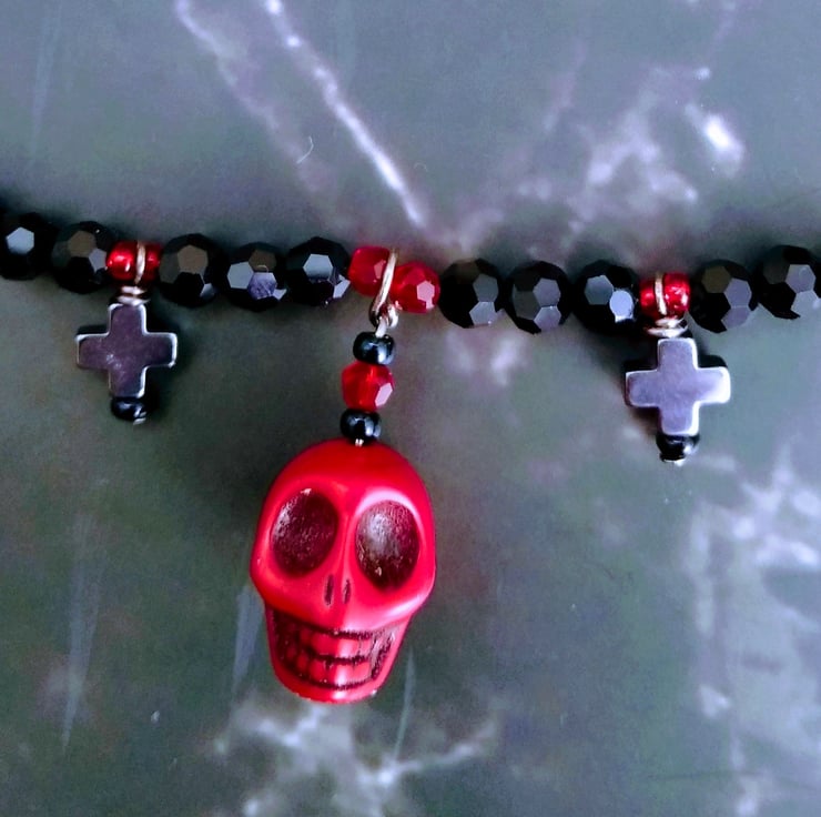 Handmade black and red crystal 16 inch (41cm) necklace with red howlite skull pendant and gunmetal coloured Hematite gemstone crosses. Necklace extendable to 18 inch (46cm).