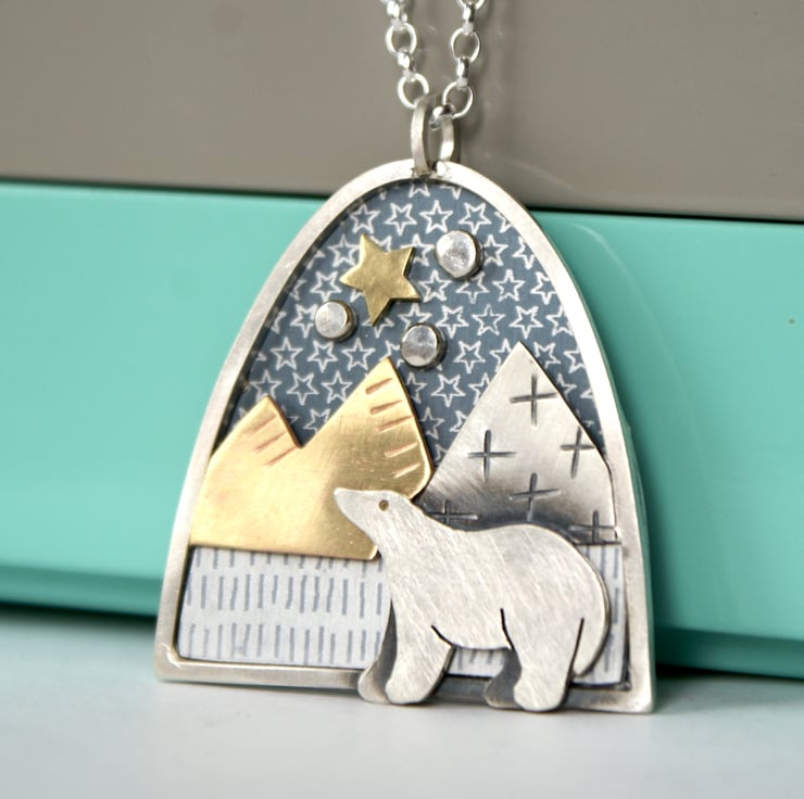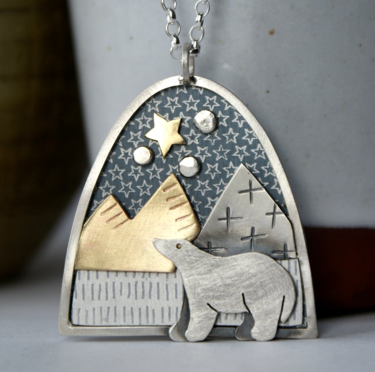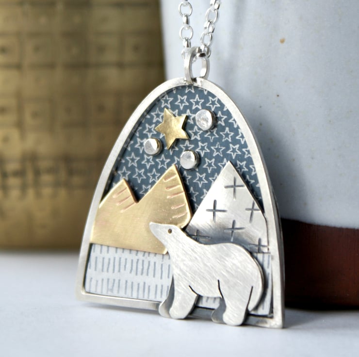 A lovely statement necklace featuring a bear walking through an icy landscape under a starry sky. This necklace is made from anodised aluminium, sterling silver, and brass, and each piece has been carefully cut with a piercing saw and constructed in layers. The bear is made from sterling silver with a slightly sparkly finish. The coloured aluminium pieces are patterned with a resist and immersion dyed. Hung from an 18 inch sterling silver chain. (Other lengths available).