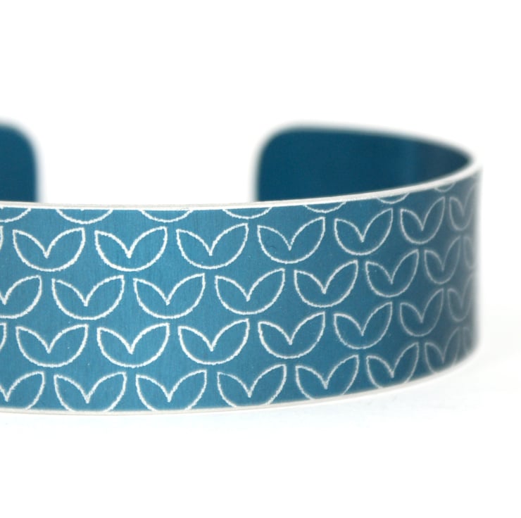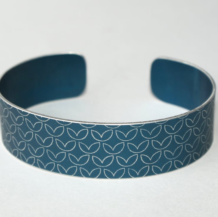 A striking bracelet/cuff made from anodised aluminium with a leaf pattern from my own hand drawing. I made the drawing into a resist and applied it to the metal. I then dye the aluminium, seal it and remove the resist which leaves the pattern showing in the original colour of the metal. The cuff is then made using traditional metalworking techniques.