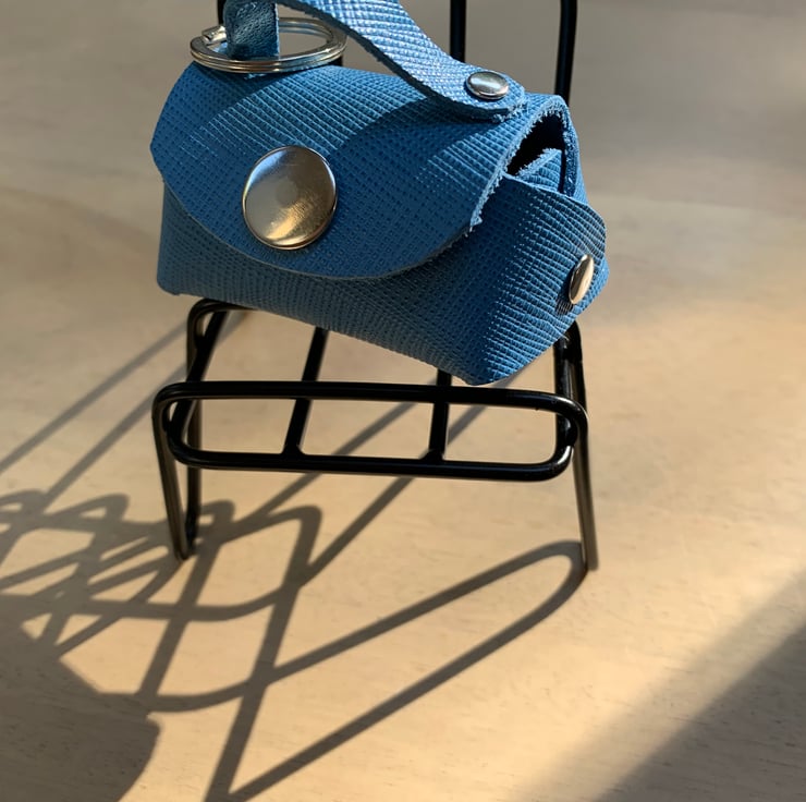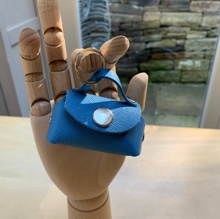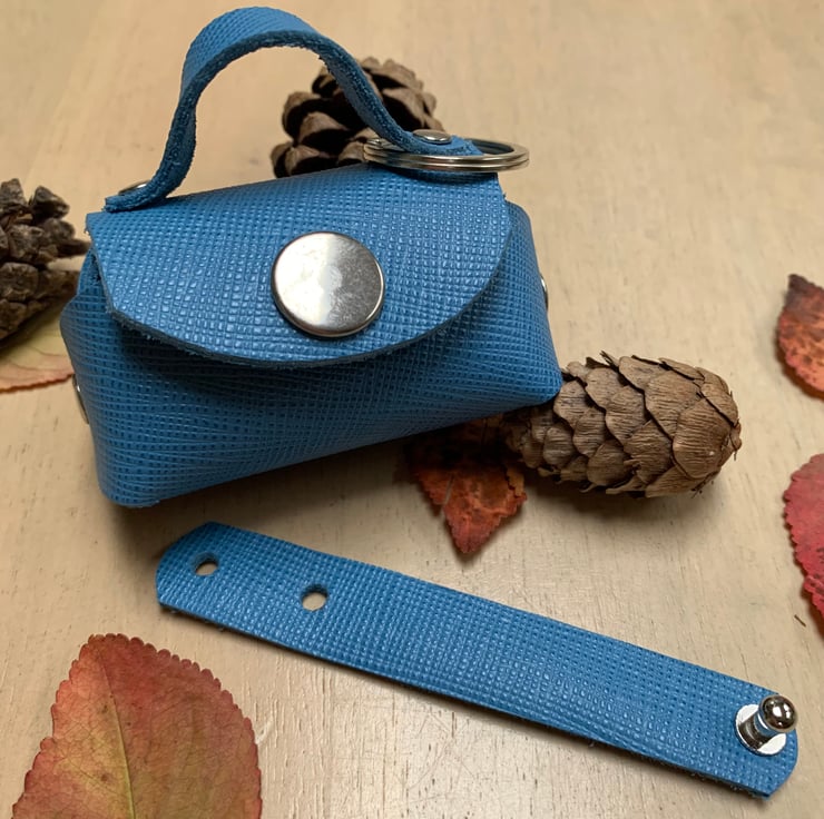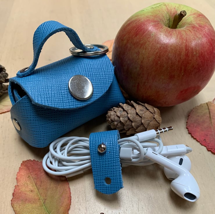 This Windsor mini pouch is a pretty blue in grained leather with silver coloured metal hardware. The interior is the perfect fit for wireless earbuds or in-ear wired headphones. Along with the keyring is a leather cable tidy to keep in-ear wired headphones neat before storing them in the bag keyring. Never lose them again!