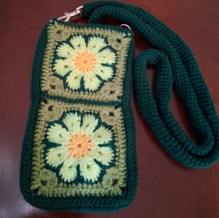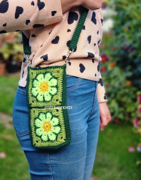 Crossbody phone bag made in granny squares. Green bag with lime green flowers on each side. Comes with a gusset so can be used for your phone and a small wallet/keys.