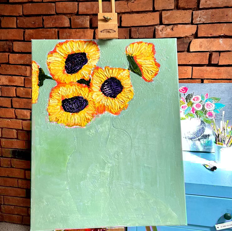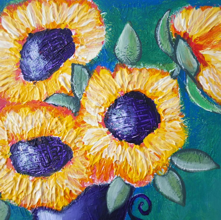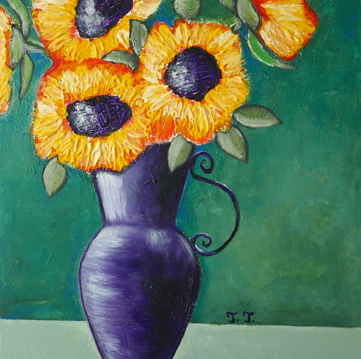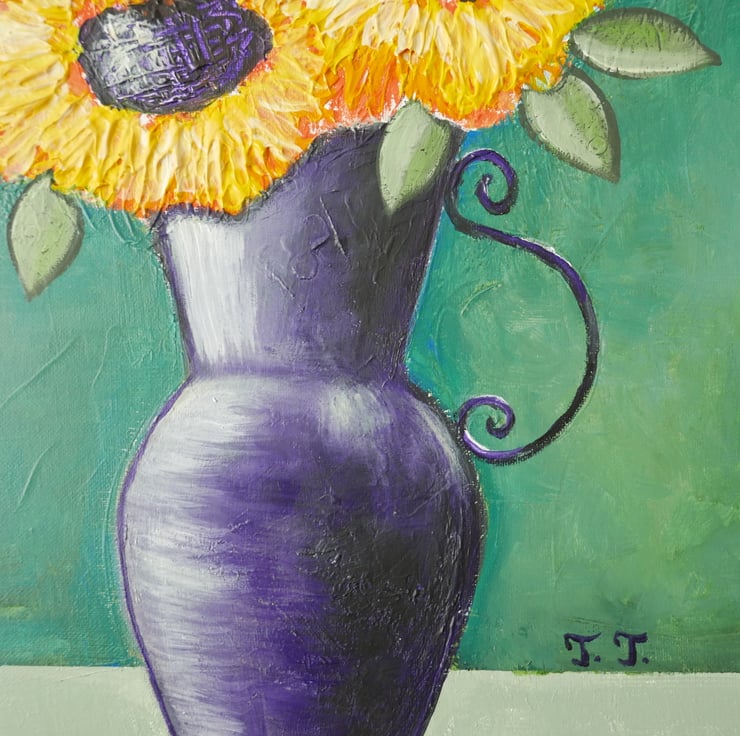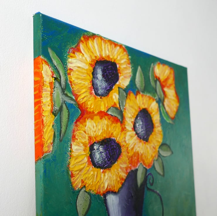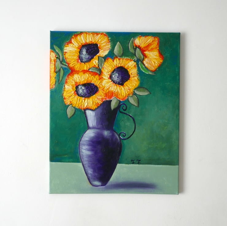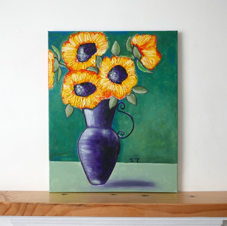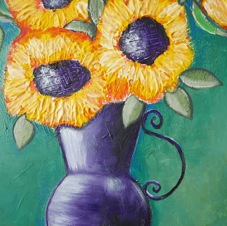 This sunflower painting is created in acrylic on canvas and the sunflowers are very textured. I used shades of yellow for the flowers and I painted a dark purple vase. The background is green and the colours go really well together. The modern still life artwork is 16" x 20" x 1", it is painted on the edges and varnished for protection.