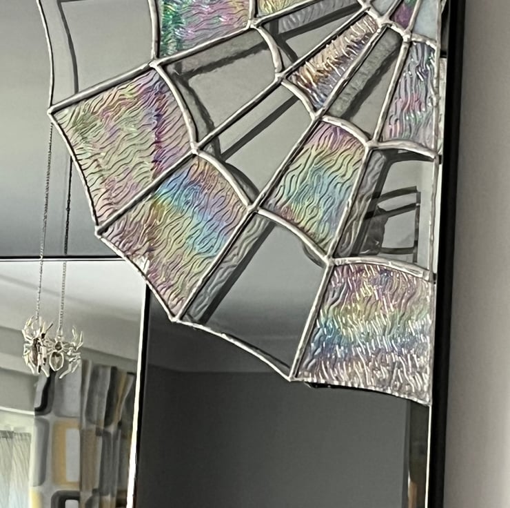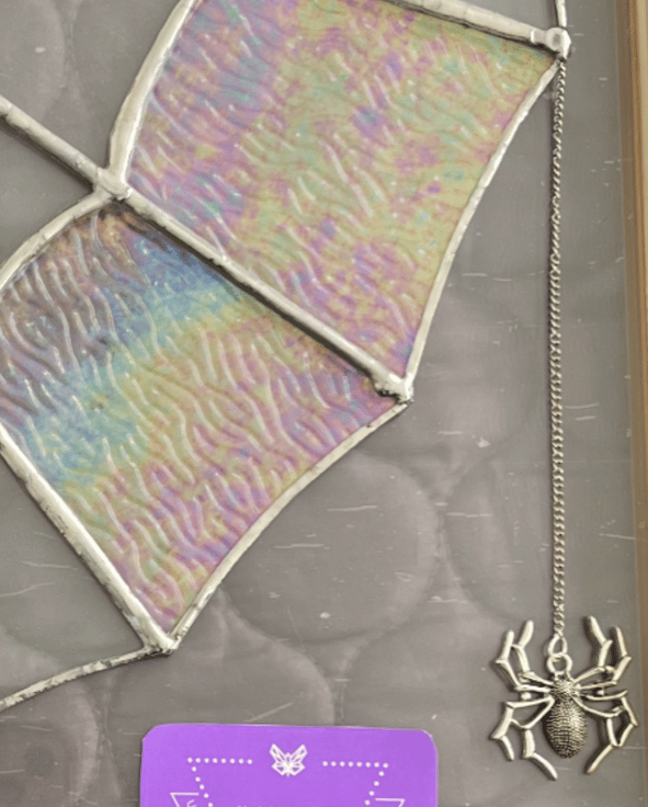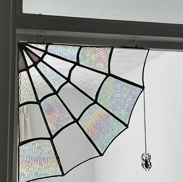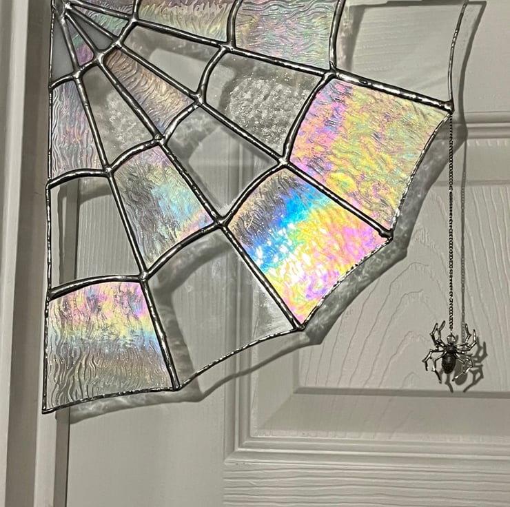 This hanging stained glass decoration is a spider web made with 20 pieces of glass (most spider webs you see for sale are made using 16) using the Tiffany stained glass method; copper foiled and soldered. A spider hangs from a fine chain - mind it might land on your head!!!. This item is carefully hand made using different types of glass including textured and iridescent glass which catches the sunlight beautifully. It is large, measuring 10" x 10" making it quite a heavy suncatcher. It is an eye-catching suncatcher which would look great hanging from a mirror, door frame, window or even a fireplace nook. An item like this deserves to be displayed all year round not just for Halloween. Can be hung using hooks or window suckers, both included. Ideal as a gift as truly one of a kind, beautifully packaged directly to your door. Free postage in the UK