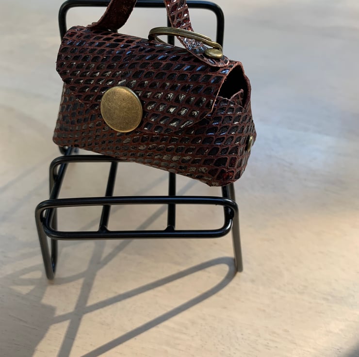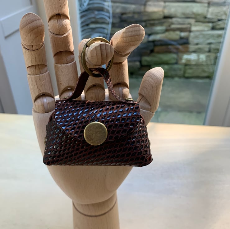 Cute and useful little handmade leather keyring in the shape of a bag to attach to keys, bag, belt or whatever you wish.