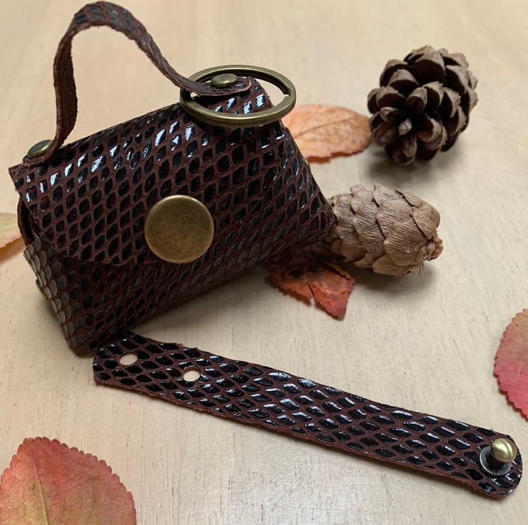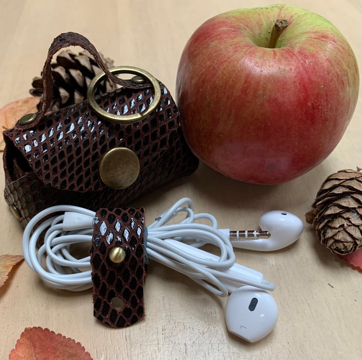 This Windsor mini pouch is a rich brown patent printed leather with antique gold coloured metal hardware. The interior is the perfect fit for wireless earbuds or in-ear wired headphones. Along with the keyring is a leather cable tidy to keep in-ear wired headphones neat before storing them in the bag keyring. Never lose them again!