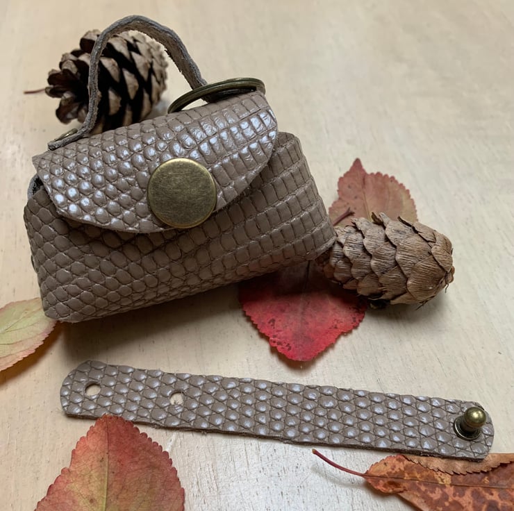 This Windsor mini pouch is a taupe snake embossed leather with antique gold coloured metal hardware. The interior is the perfect fit for wireless earbuds or in-ear wired headphones.