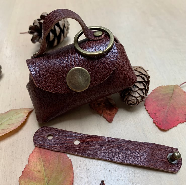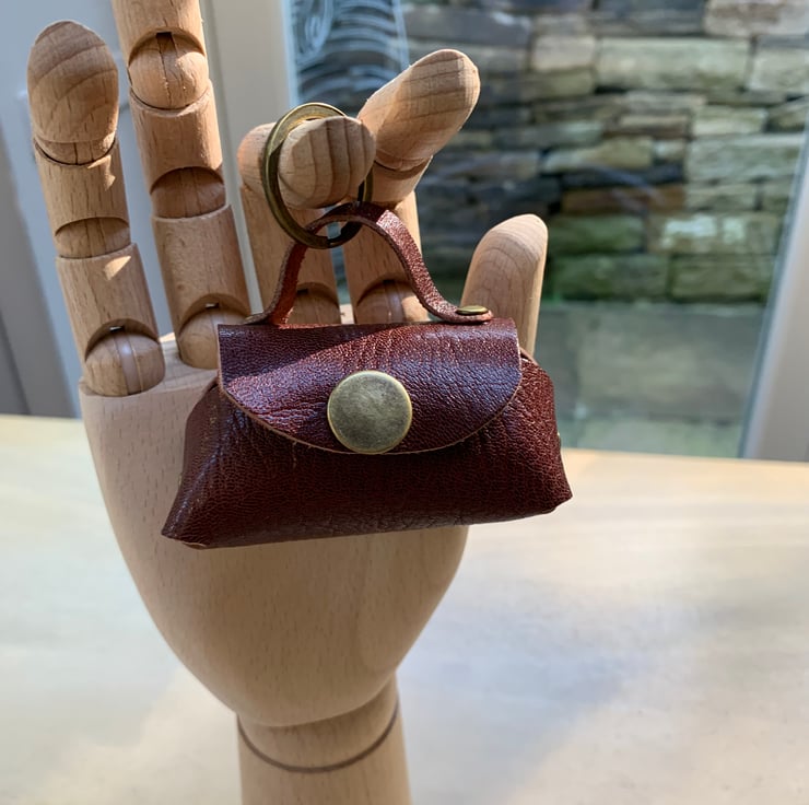 Cute and useful little handmade leather keyring in the shape of a bag to attach to keys, bag, belt or whatever you wish.