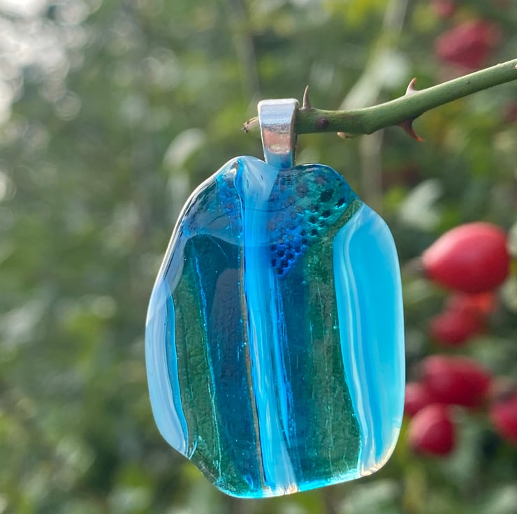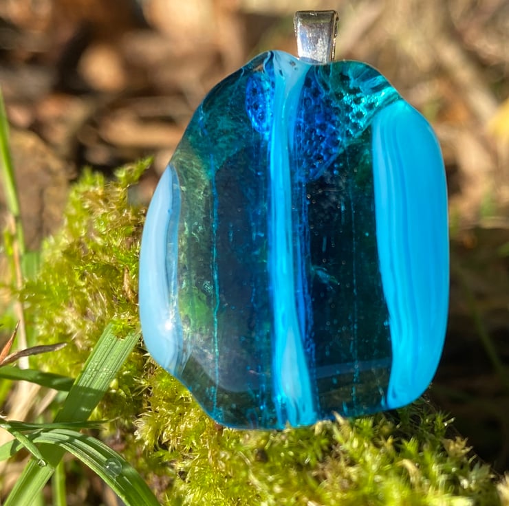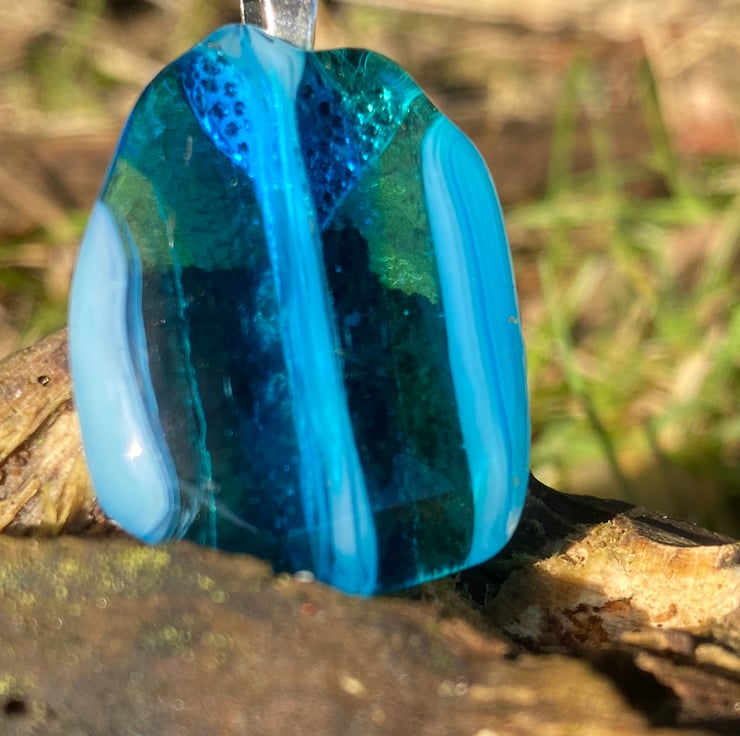 A mix of transparent and opal glass creates stunning veins of blues in this beautiful fused glass pendant. With the feel of ocean waves this is a cool and calm pendant that would compliment both formal and casual occasions. Presented on a simple waxed cord and in a gift bag it would make a most thoughtful gift for any recipient.