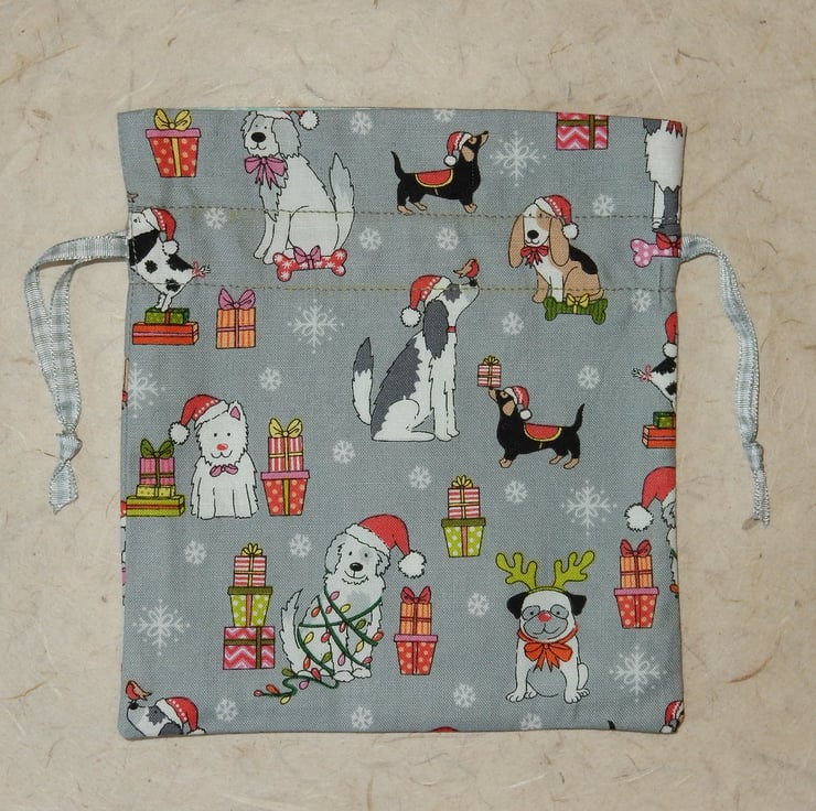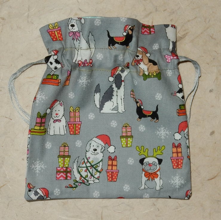 This drawstring bag is full of cute dogs, with bones, presents and Santa hats. It measures 6.5 x 5.5 inches (approx. 17 x 14 cm), and is fully lined in a pale floral print fabric. There is a drawstring closure with check ribbon, which can be used to hang it from a Christmas tree. This would make a great gift bag for dog lovers or even gifts/treats for a favourite dog.