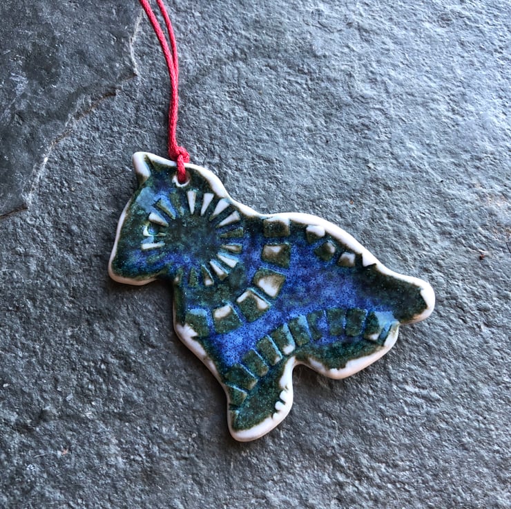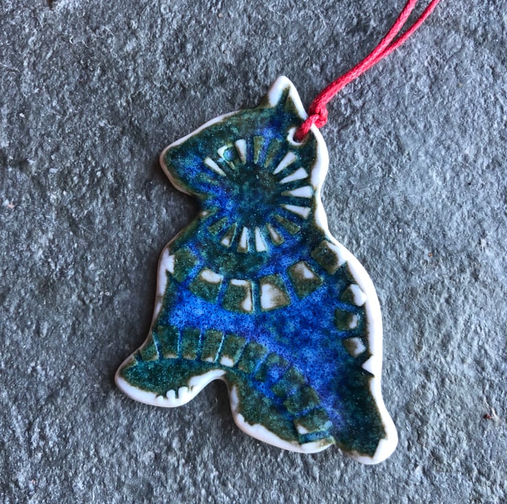 I make Kitty from fine porcelain, hand decorating and glazing her. She is hung on red cord ready to hand in your home, your gift, and then on your Christmas tree. Some cat lovers who have bought them can't bear to put them away after Christmas, and leave them out all year round and who can blame them?