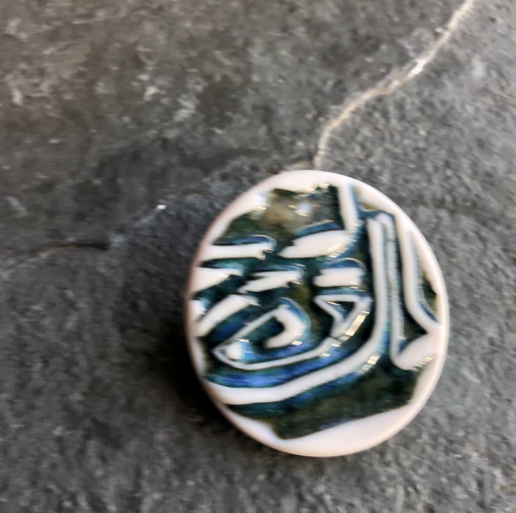 Porcelain brooch graphic blue green white The Porcelain Menagerie