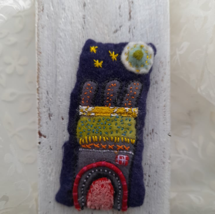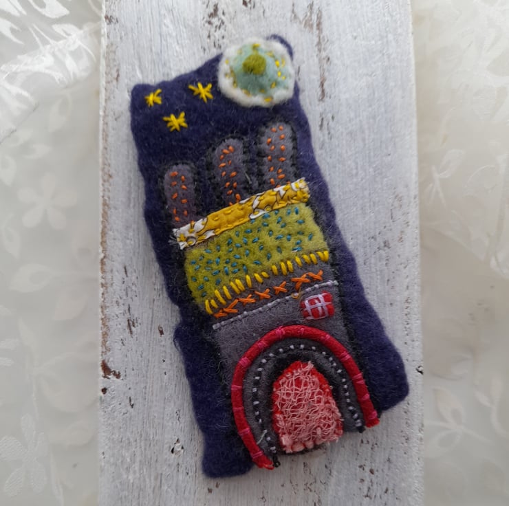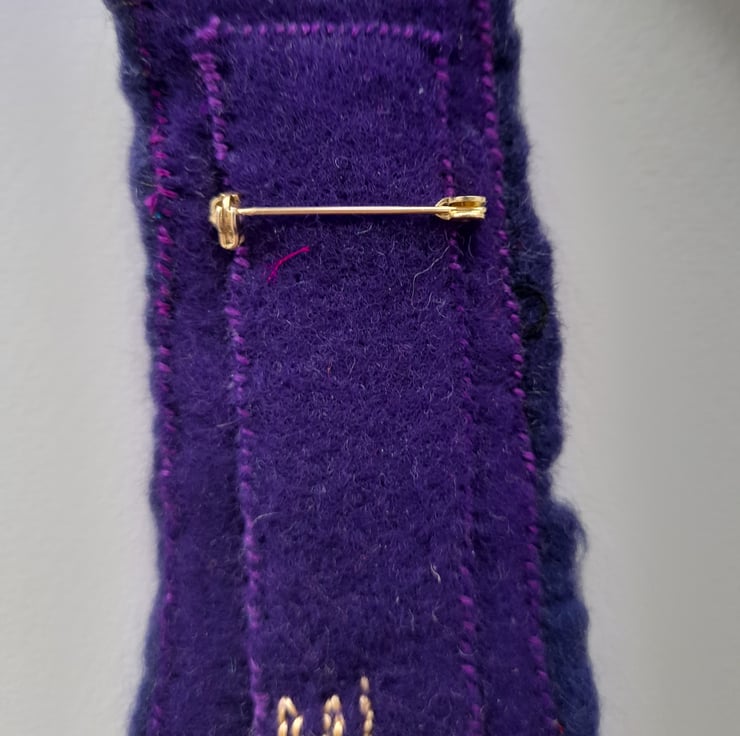 These brooches are made by wet felting, hand stitching, and applique all combined. It take several hours to make each one and I use vintage textiles and recycle textiles when using applique. The brooch backs are sewn in and are made from either silver plate or gold plate. The brooches are backed with machine made felt to give more strength.