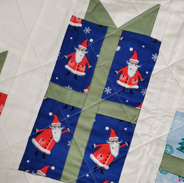 This Christmas quilted table runner / table topper / dresser cover is created using fussy cut Christmas fabric pieces.