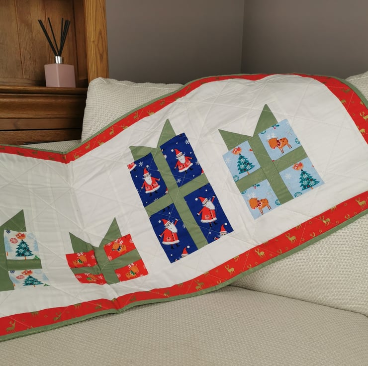 Made from over 60 hand cut pieces, sewn together to create a 5 Christmas present patchwork design. It is backed with bright red fabric with gold reindeer print and padded out with a light weight cotton wadding.