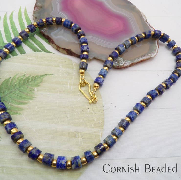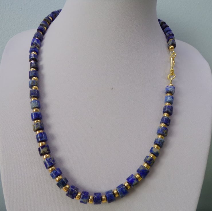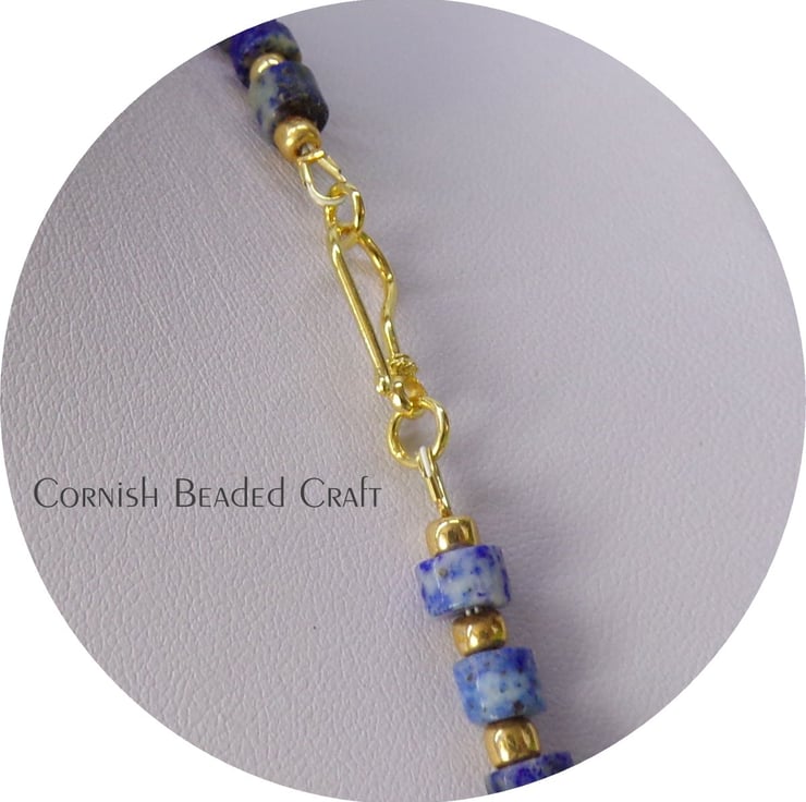 This is a Adorable Blue Lapis Lazuli Necklace -Gold Toho Beads - With a 5x27mm 14K Gold S Hook Clasp