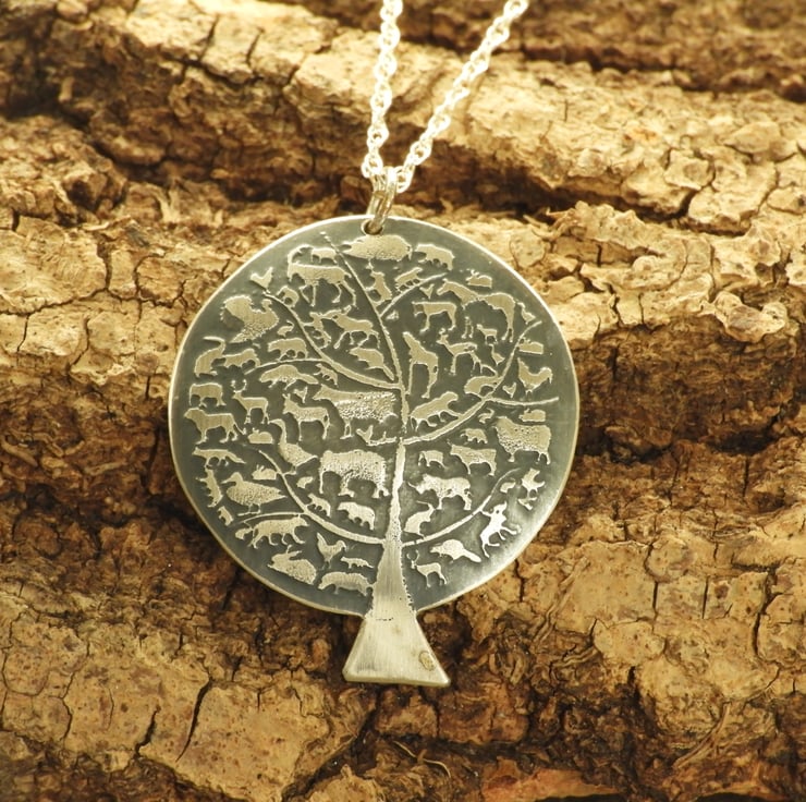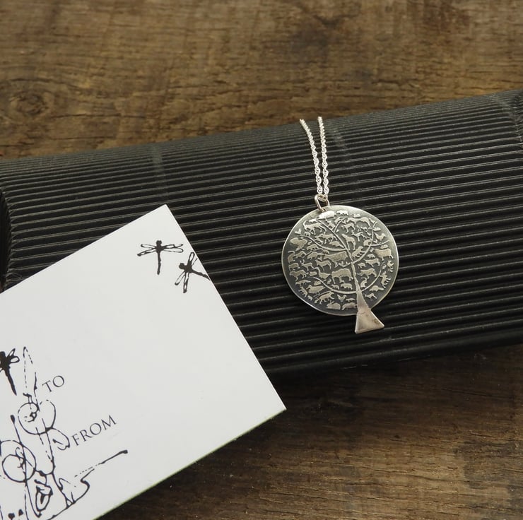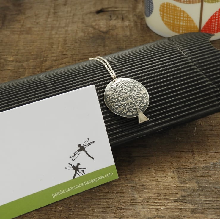 A beautiful etched eco silver pendant featuring an assortment of animals and birds - the perfect gift for someone who loves nature!