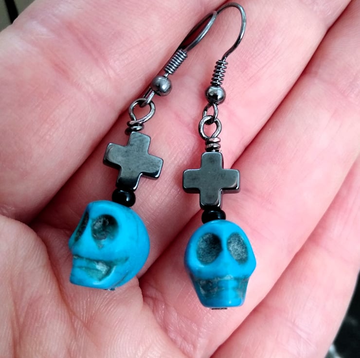 Blue Howlite Skull and gunmetal Hematite gemstone cross on a black plated ear wire. Unisex gothic style earrings also ideal for for Halloween parties.