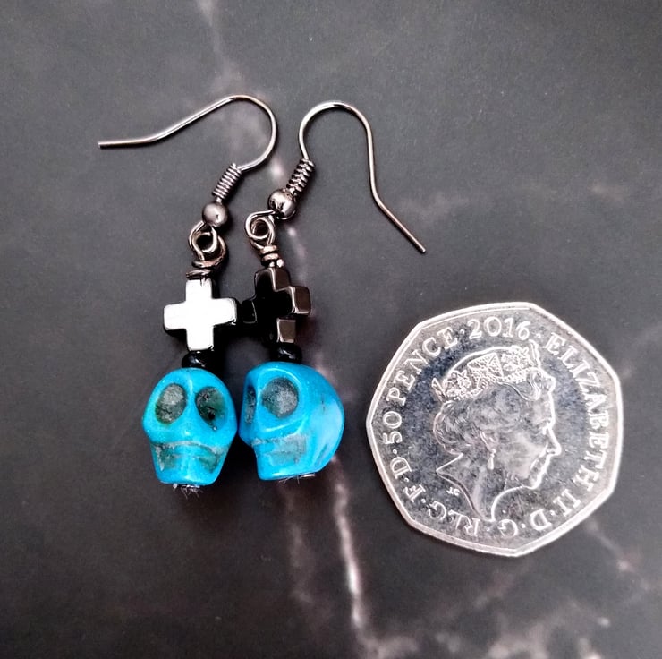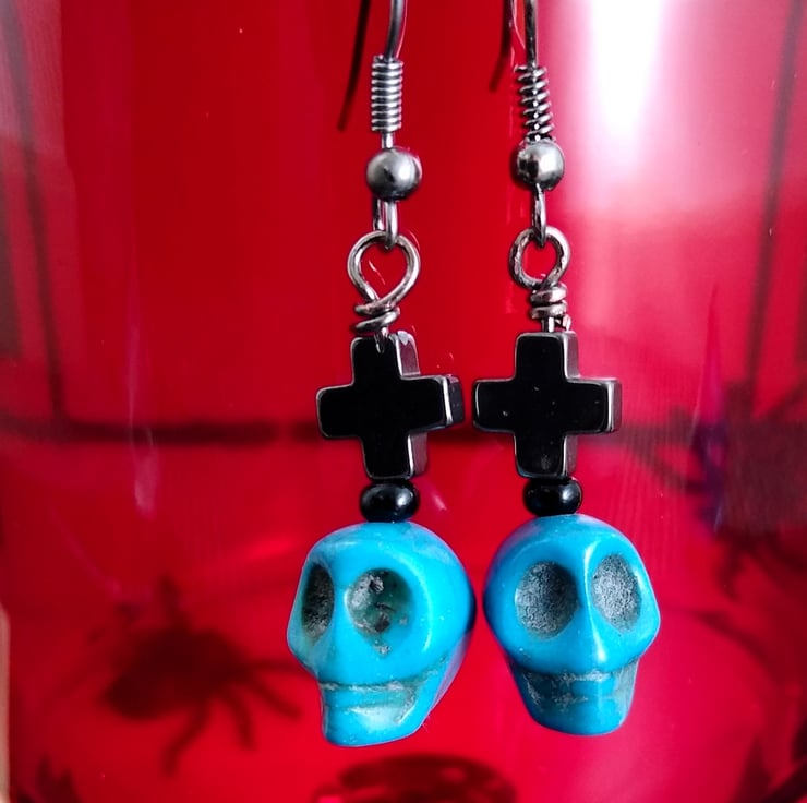 Blue Howlite Skull and gunmetal Hematite gemstone cross on a black plated ear wire. Unisex gothic style earrings also ideal for for Halloween parties.