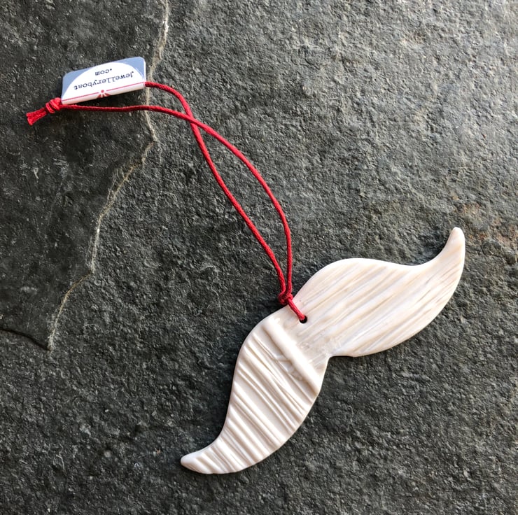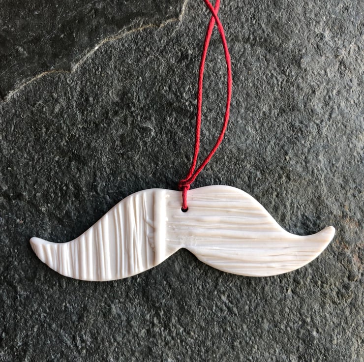 Porcelain moustache, high fired white porcelain on a red cotton cord.