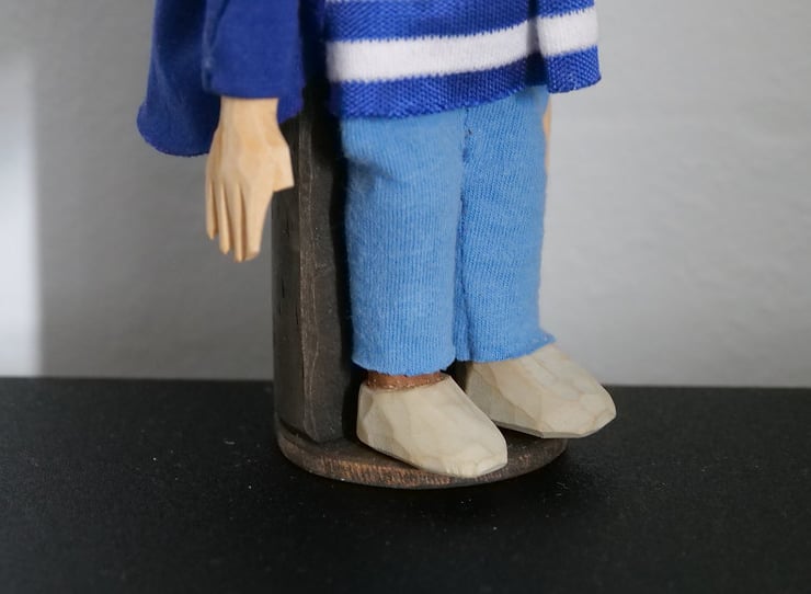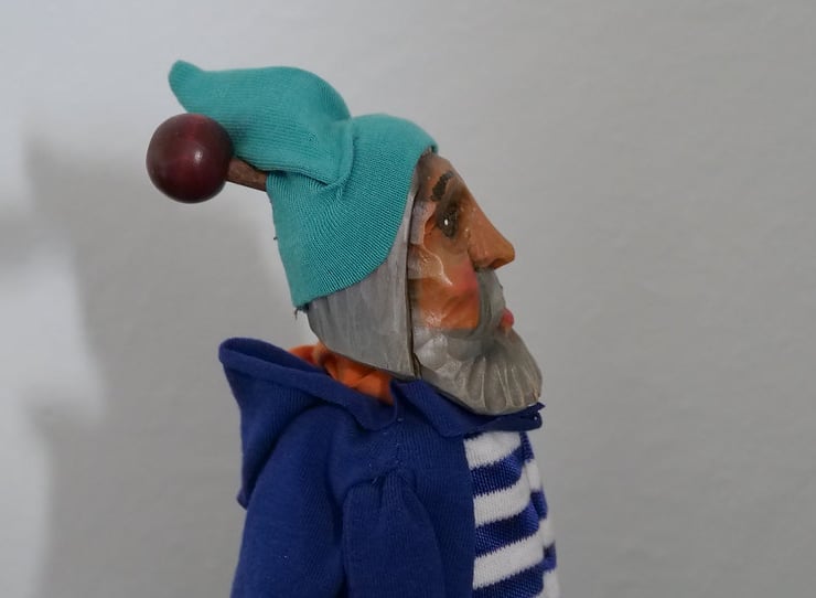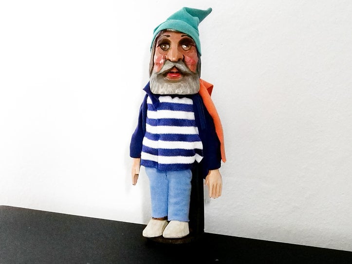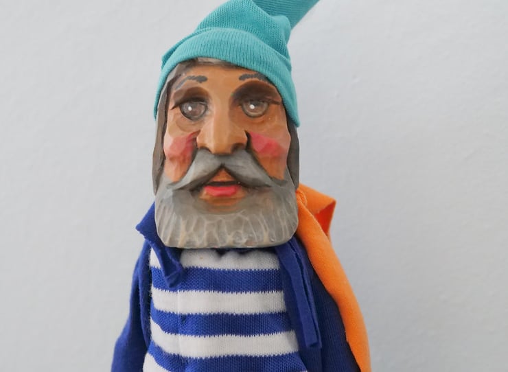Great fun decorative/tabletop puppet. Fixed to a stand you can rotate the head using the rear knob or by hand you can move his arms or legs.
