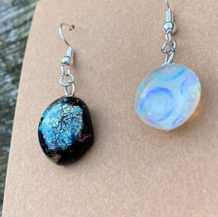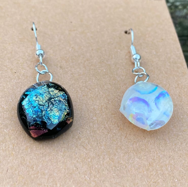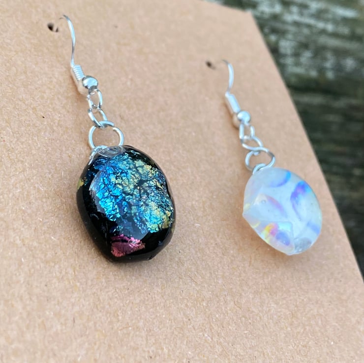 Created from stunning dichroic glass these interesting earrings feature a black cabochon one side and a white the other, each with a rich iridescent element, which allows them to play with the light. These earrings are on simple ear wires and are perfect for anyone with pierced ears.