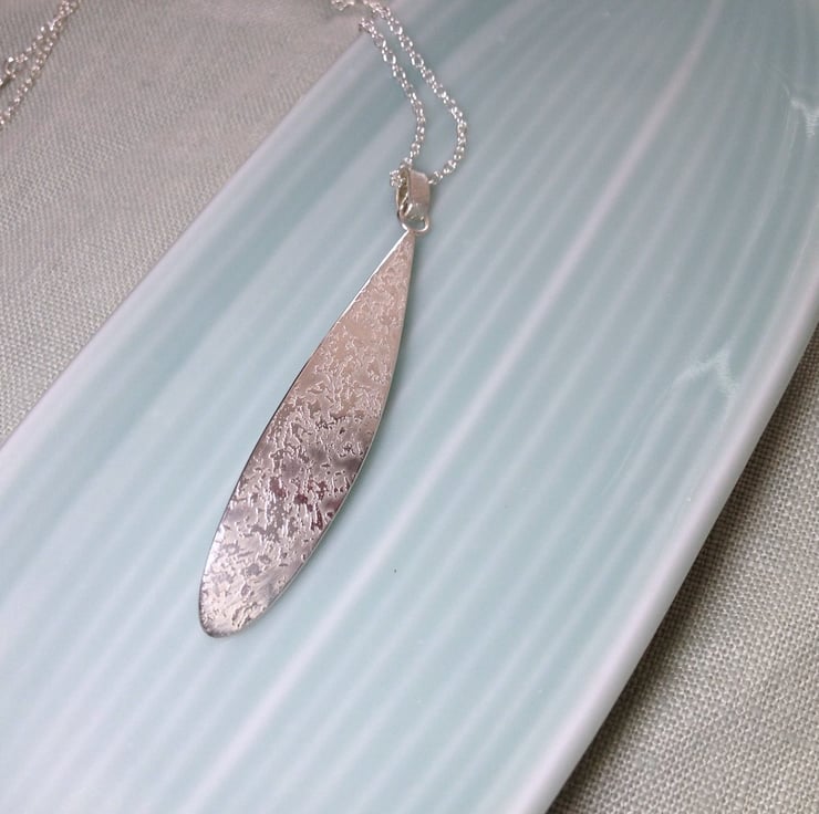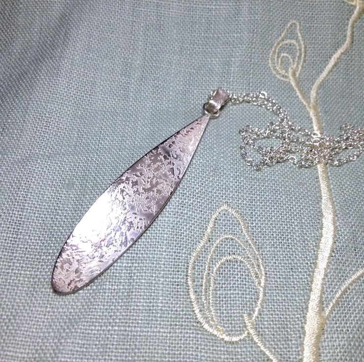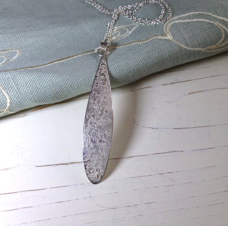 Sterling silver pendant necklace, teardrop shaped and etched and hung on a 18" silver chain. From the top of the bail the pendant measures approx. 70mm long and is about 13mm at it's widest.