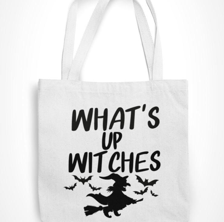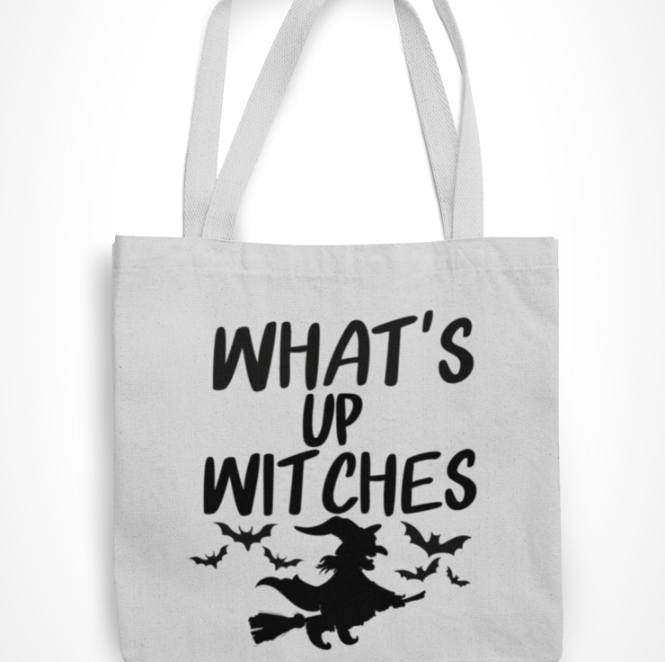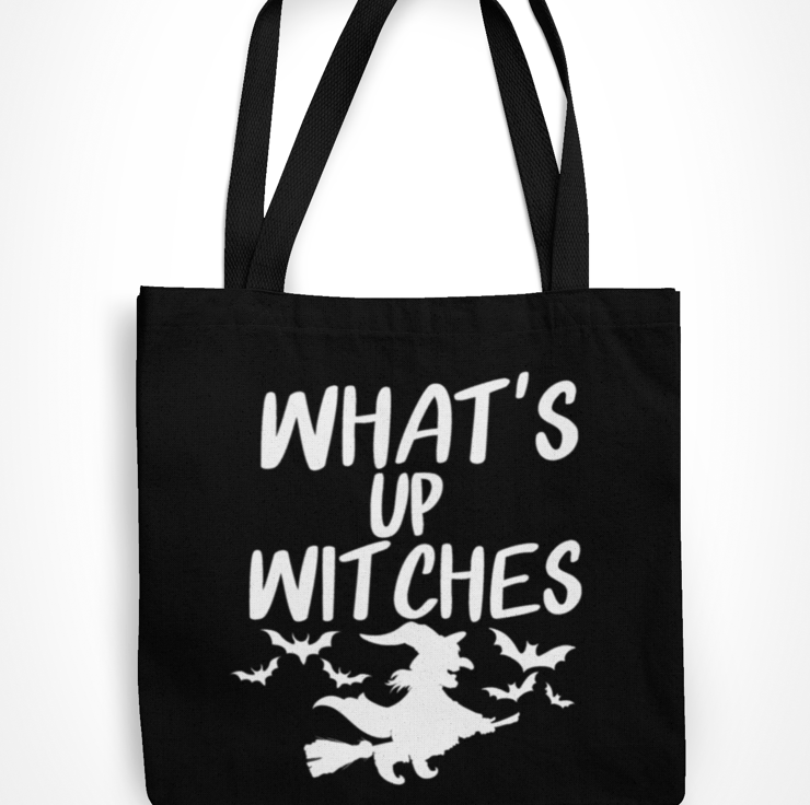 What's Up Witches Tote Bag- Novelty Funny Halloween themed Totebag