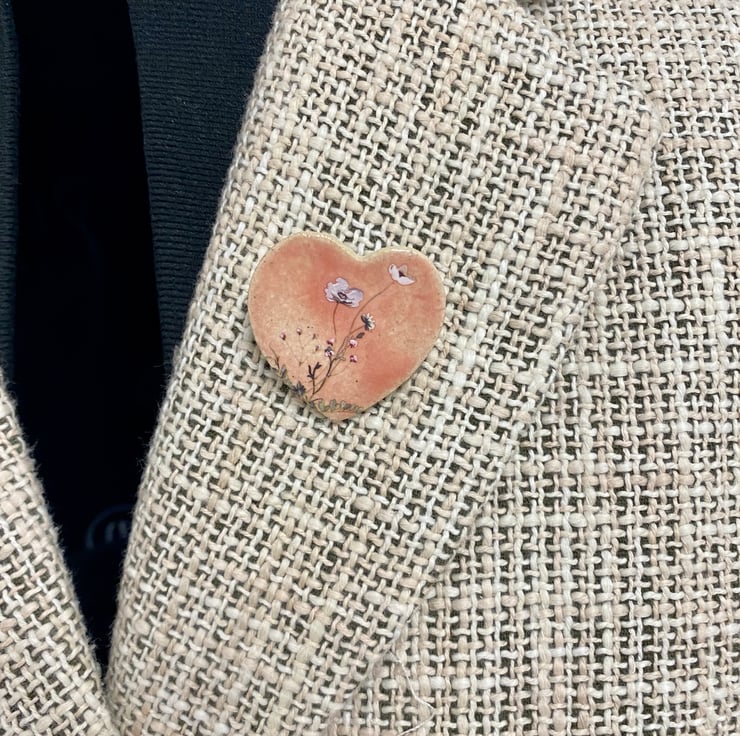 Handcrafted, in earthenware clay, glazed in a blend of glazes creating a beautiful pink glaze, finished with a floral transfer and varnish. Fastened with a brooch pin.