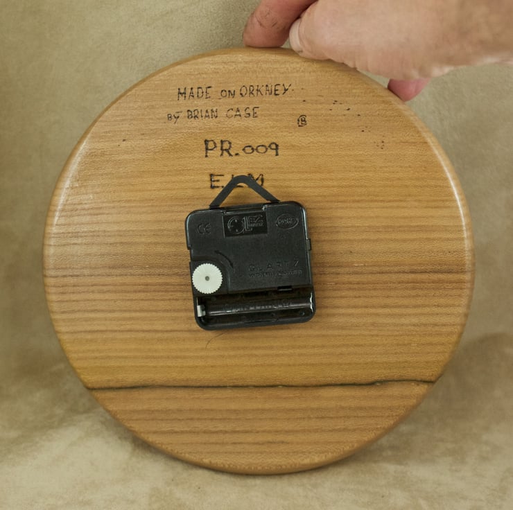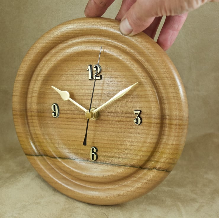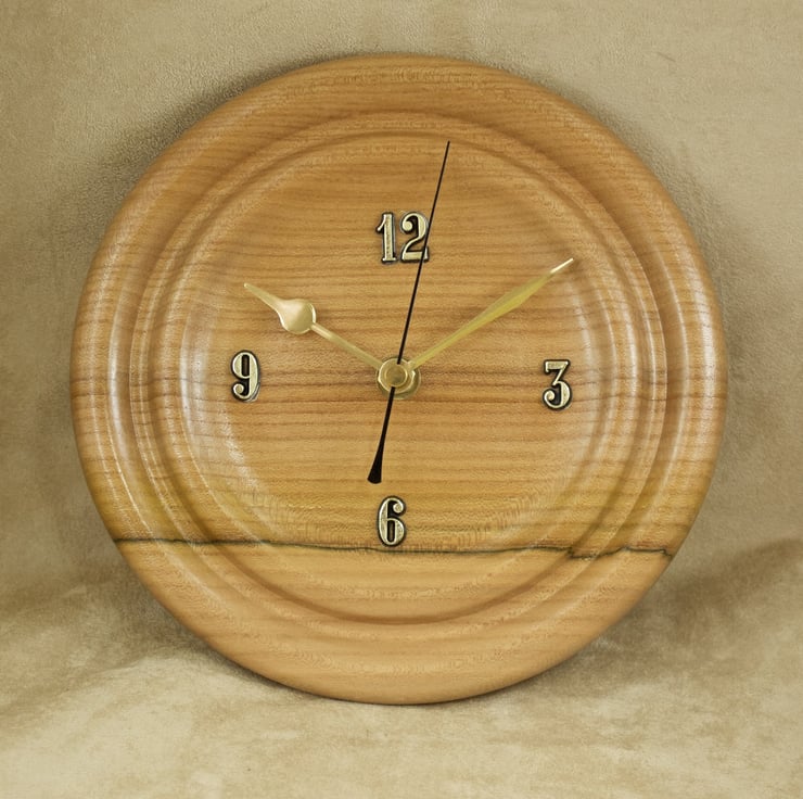 This lovely wall clock, crafted by hand from a piece of elm, has a dark line of spalting towards the bottom of the clock face. I have turned concentric rings on the face of the clock resembling the ripples from a pebble dropped in a pond and the wood has dark, horizontal grain running across it. The clocks metal hands are gold coloured with a long black metal second hand, and it has a ticking quartz movement that uses one AA battery (not supplied). I have only used numerals at the cardinal points to keep the clock visually uncluttered, emphasising the beauty of the elm wood. There is a wall hanger built in to the top of the movement, so all you need to do is find a nice place in your home for it to live. The clock is about 200mm diameter.