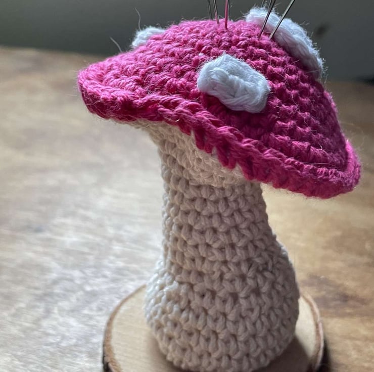 A sweet pink mushroom pincushion crocheted using 100% cotton yarn and filled with soft fibre stuffing and mounted on a 100% wooden slice base.