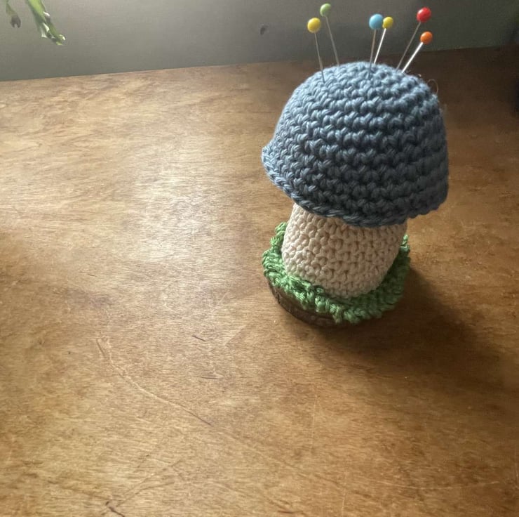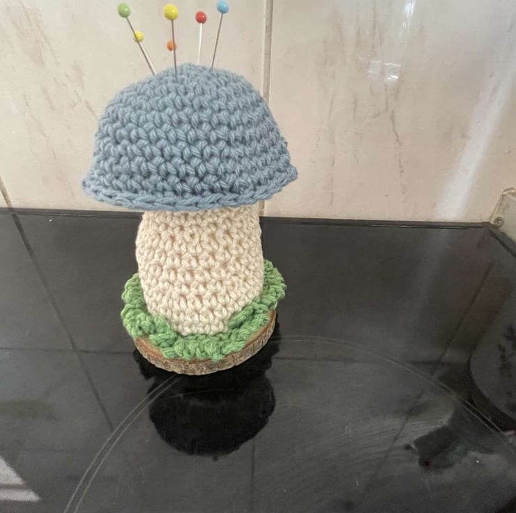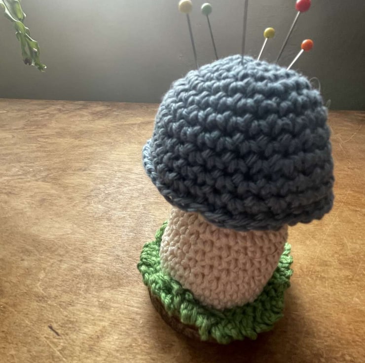 A sweet blue mushroom pincushion crocheted with 100% cotton yarn and filled with soft fibre stuffing and mounted on 100% wooden slice base.