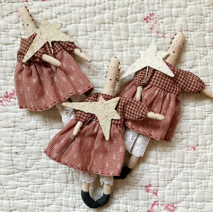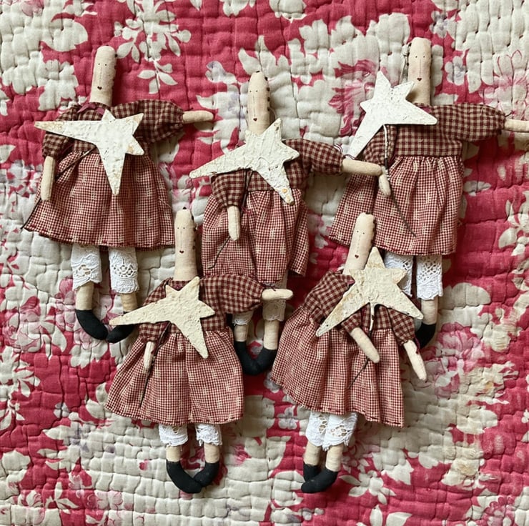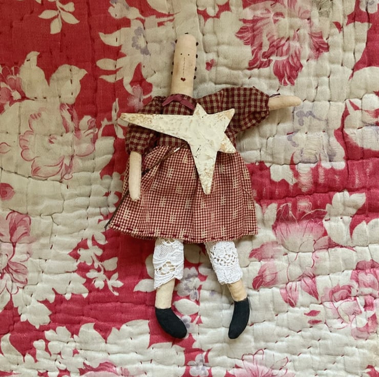 This miniature homespun doll is approx 20cm long, The body is made from tea stained cotton. She is wearing bloomers made from vintage lace and her dress is made from two woven homespun fabrics in reds, finished off with cuff ties.
