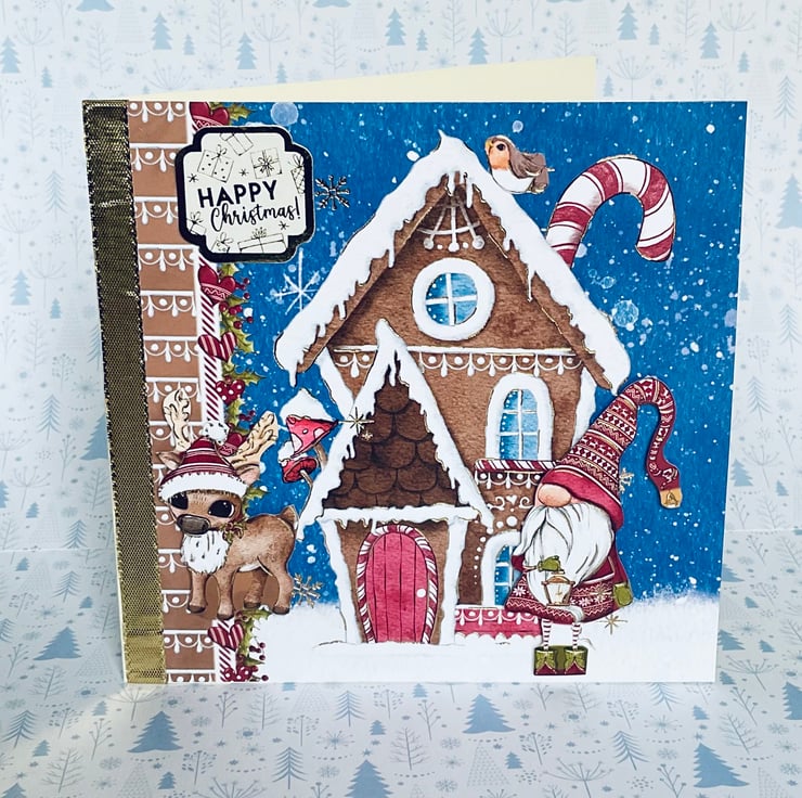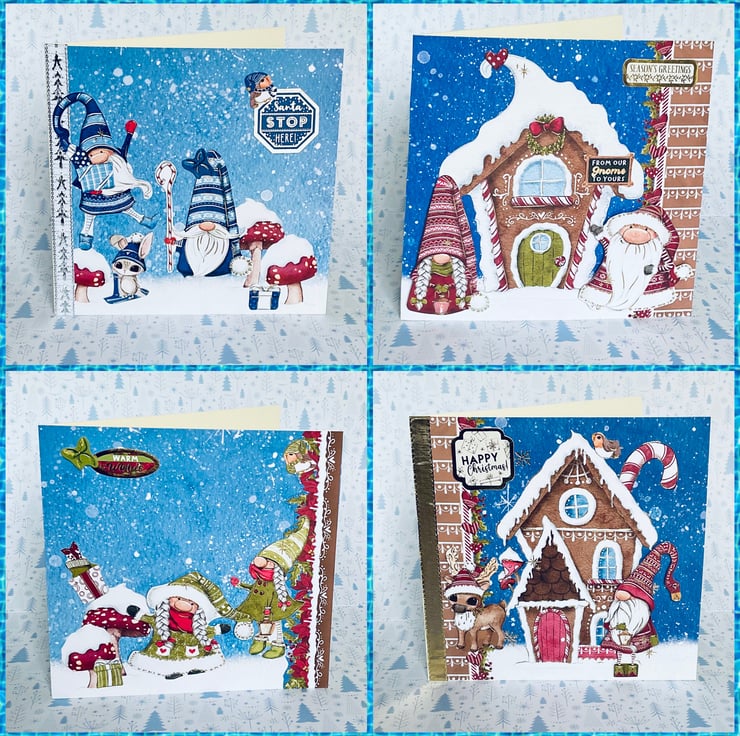 Being sold as a set of four, these cards feature cute 3D die cut festive images of gnomes and woodland creatures on a snowy background highlighted with silver and gold.