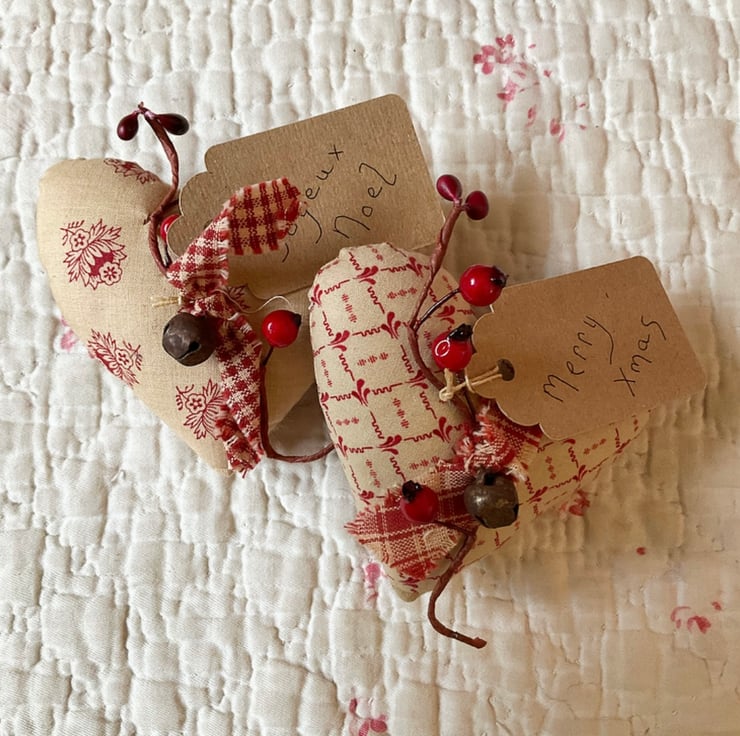 Each heart is decorated with a berried sprig, fabric trim, rusty jingle bell, and labelled tag - Merry Xmas and Joyeux Noel.