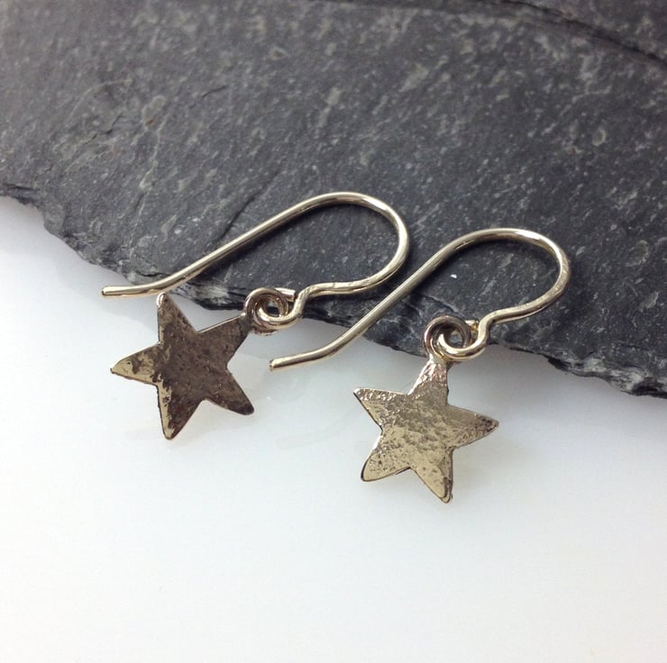 Star shapes have been hand cut from thick 9ct yellow gold recycled sheet, beaten for texture and hung from handmade gold hooks.