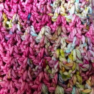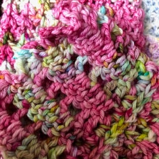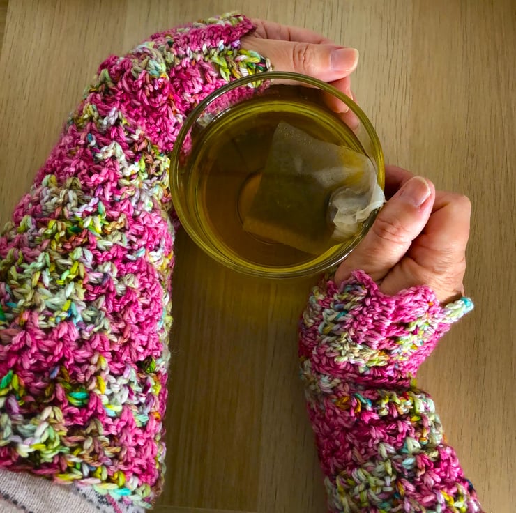 These long arm warmers are crocheted using my Studio Sleeves pattern (available separately as a crochet pattern in my shop) with a lovely hand dyed merino yarn in bright pink w/ith splashes of pastel colours.