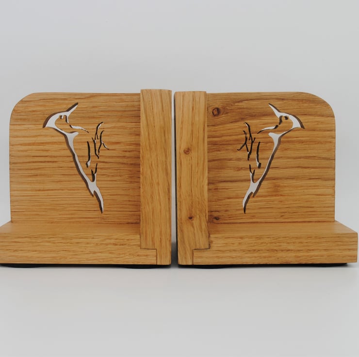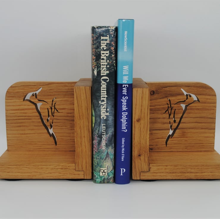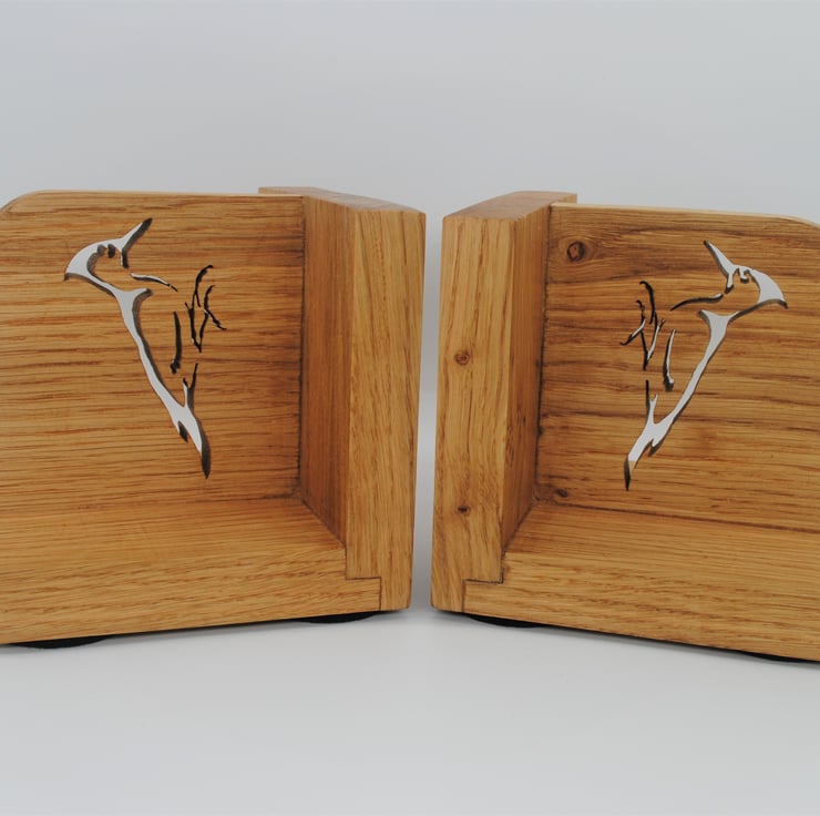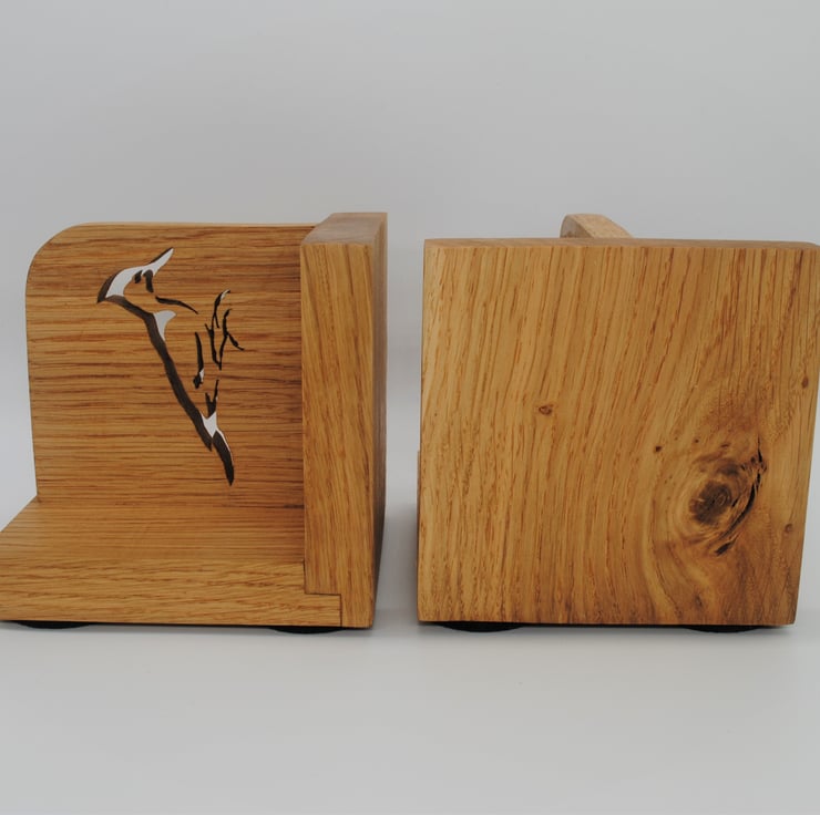 These decorative bookends are perfect for the home, study, or office. Made from solid oak and finished in Danish Oil to bring out the natural grain of the wood. The Woodpecker design has been cut with a scroll saw.