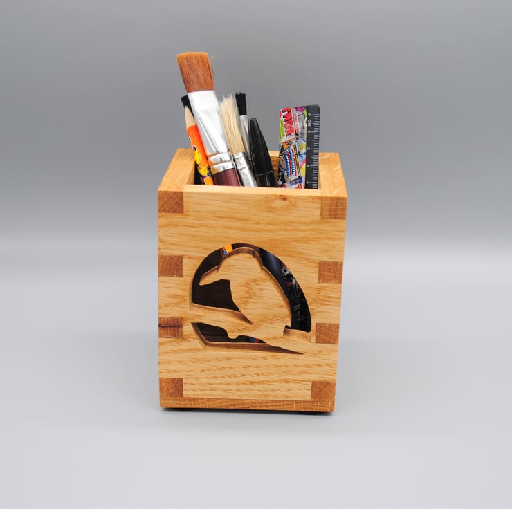 This decorative desk tidy is perfect for the home, study, or office. Made from solid oak and finished in Danish Oil to bring out the natural grain of the wood. The Kingfisher design and box joinery have been cut with a scroll saw.