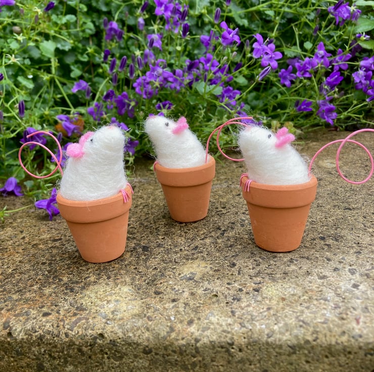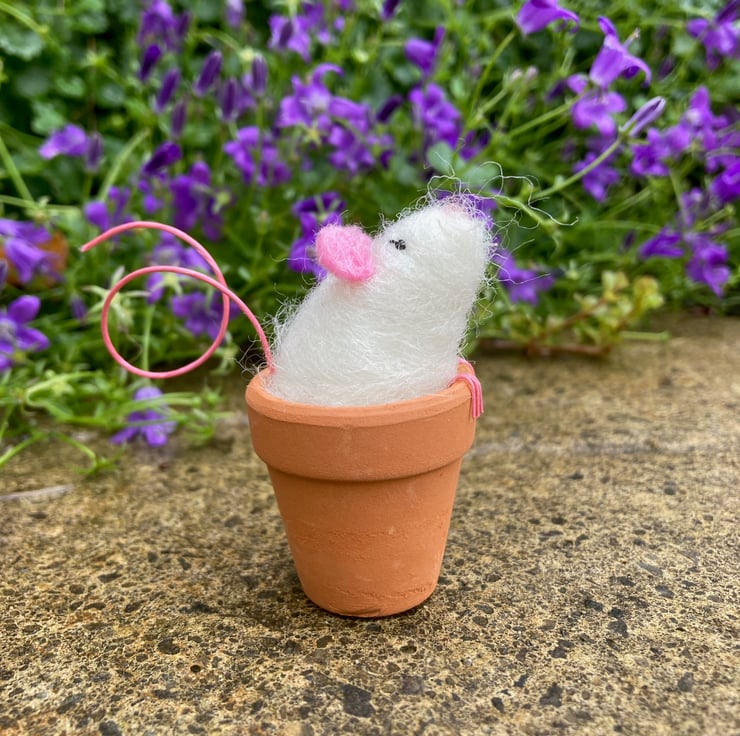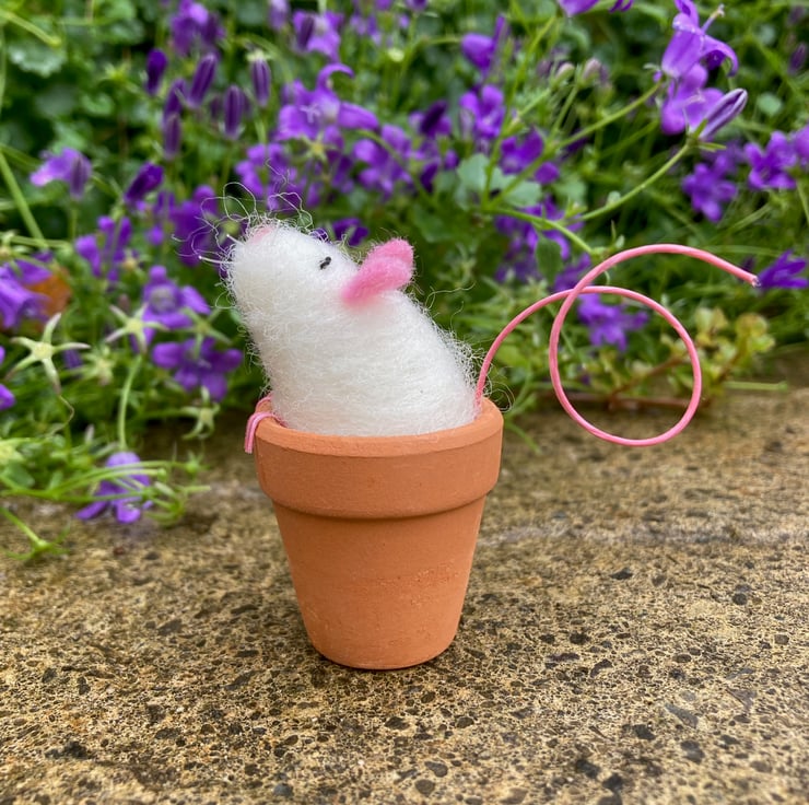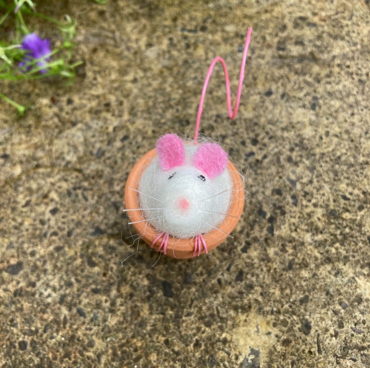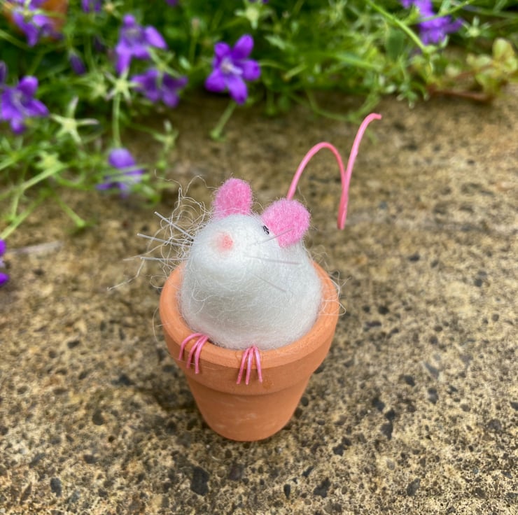 This adorable little mouse has been needle felted using white corriedale woollen fibres and a barbed felting needle to sculpt it into shape. The eyes have been stitched on and nylon whiskers and pink felt ears added. The mouse had then been placed in a miniature terracotta plant pot and tiny wire feet and curly tail added.