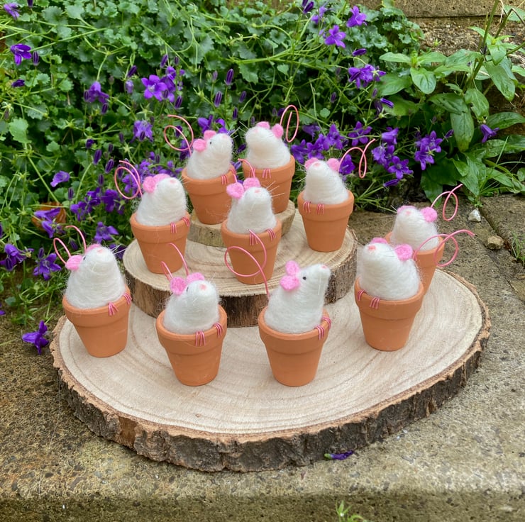 Each mouse ornament measures approximately 6cm high, the flower pot is 3.5cm in diameter.