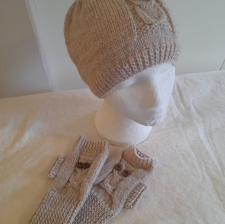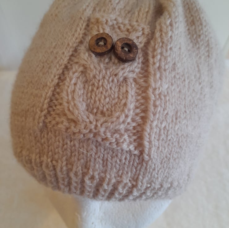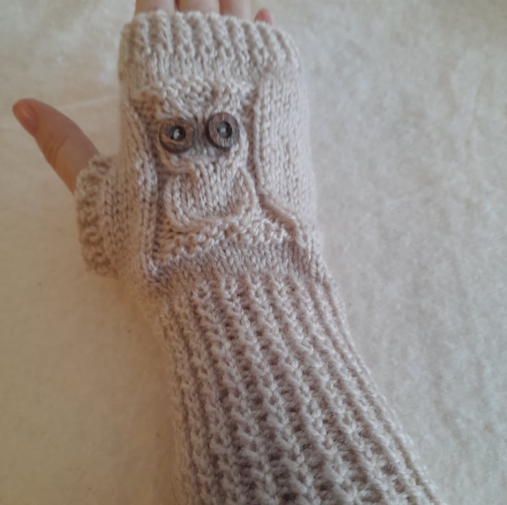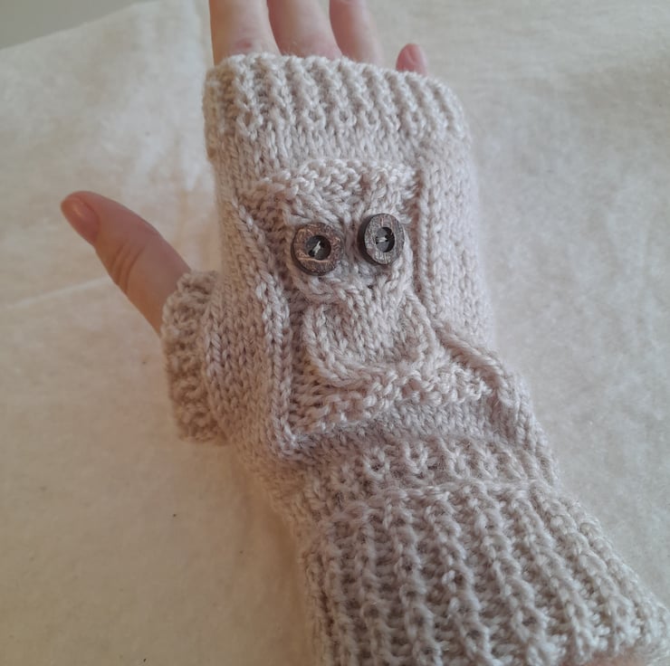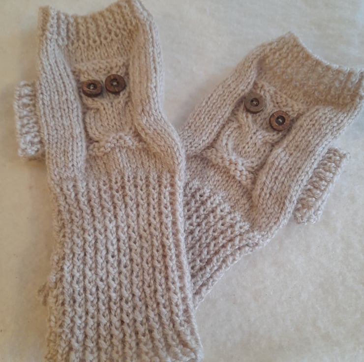This is a quirky set which I have knit following a wrist warmer pattern I saw online (not my design). I have adapted the pattern to give the thumb holes in the wrist warmers a ribbed edge and adapted a plain hat pattern to also depict an Owl. The 'Owls' eyes are made using wooden buttons.
