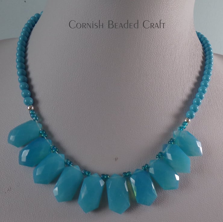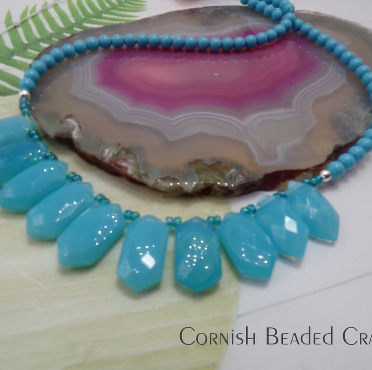 This is a Handmade Blue opal Quarts Shaped Polished Gemstone Necklace - Sterling Silver Spring Clasp