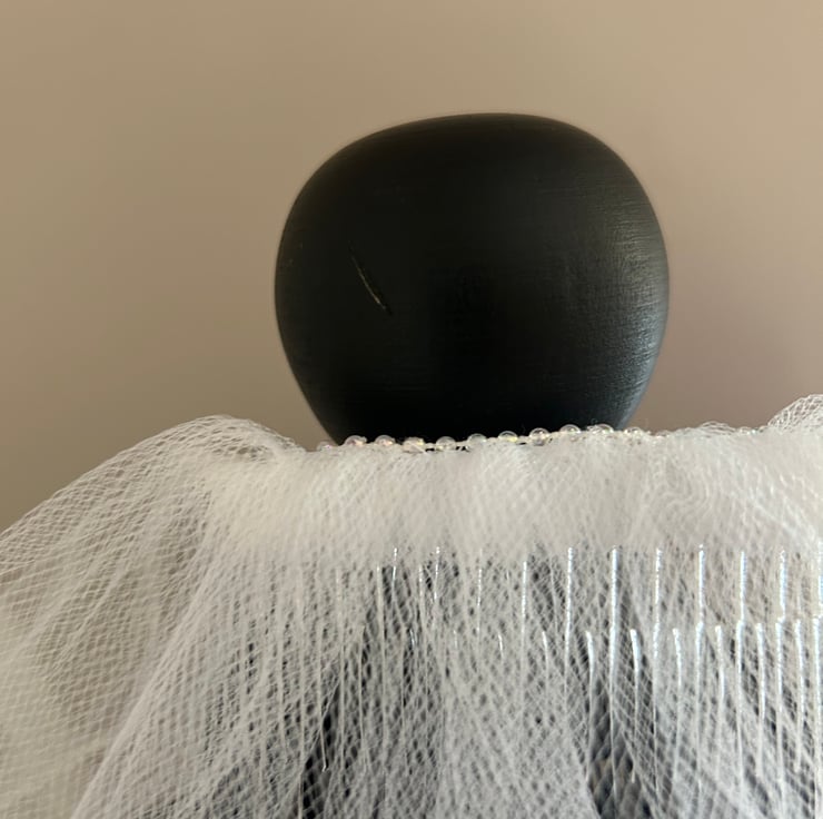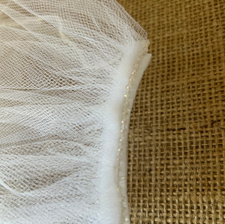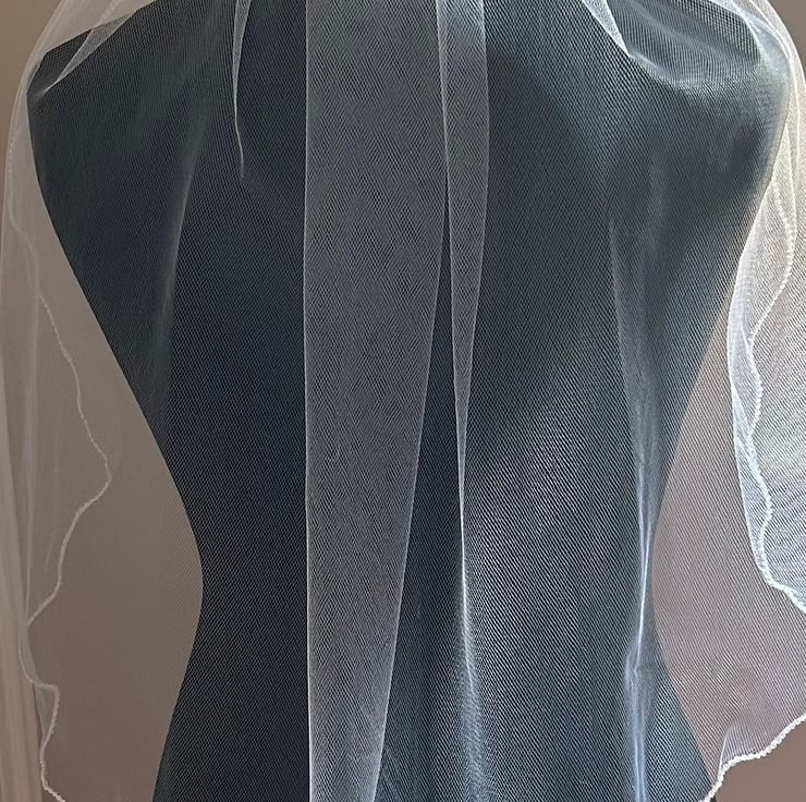 White tulle, single tier, elbow length veil. This veil has hand sewn pearlescent beading to the edges and comb edge.