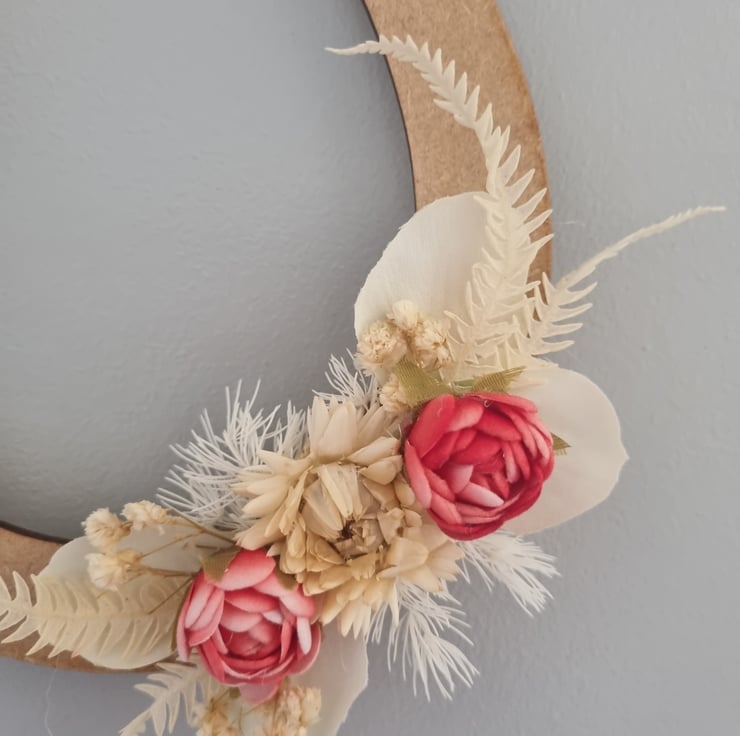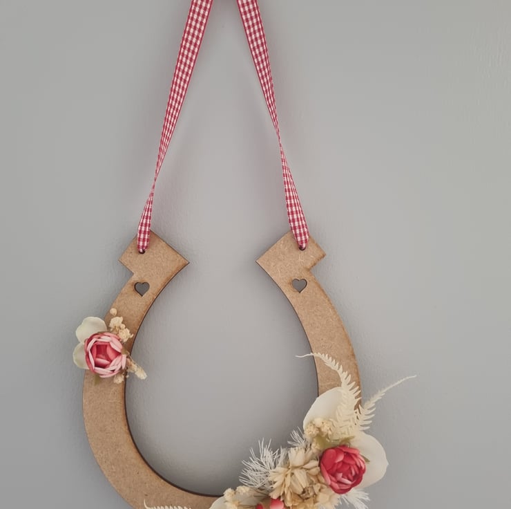 Rustic style horseshoe, a perfect for gift for a bride or for decoration. This horseshoe has a natural finish with red gingham ribbon, red and ivory artificial and dried flowers and foliage. This horseshoe measures approximately 6 inches wide and 7 inches long, plus the ribbon. This will be delivered in an individual box.