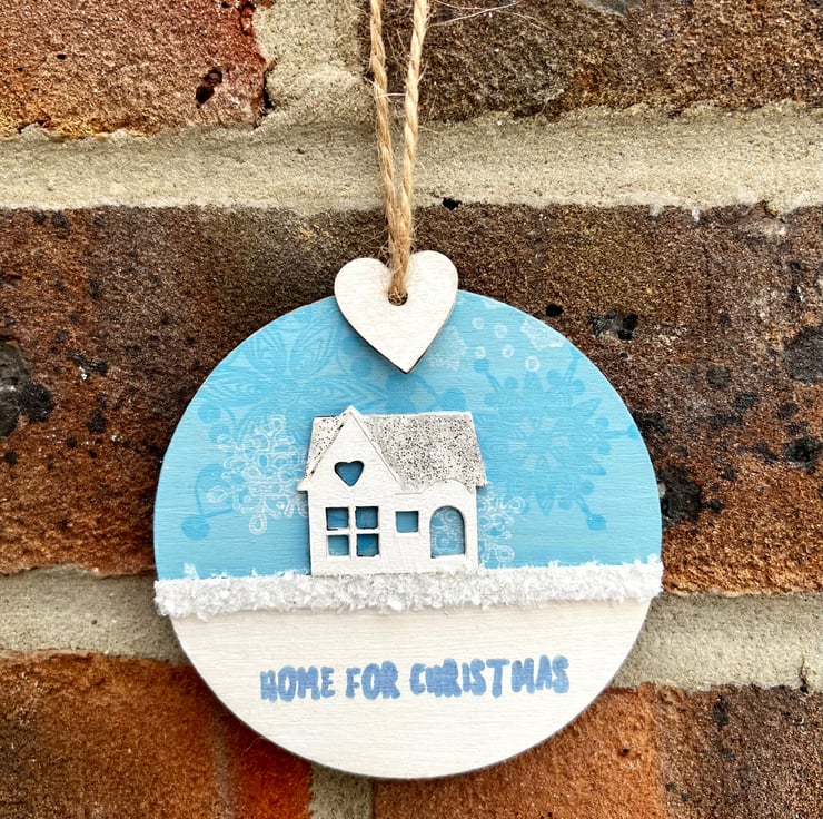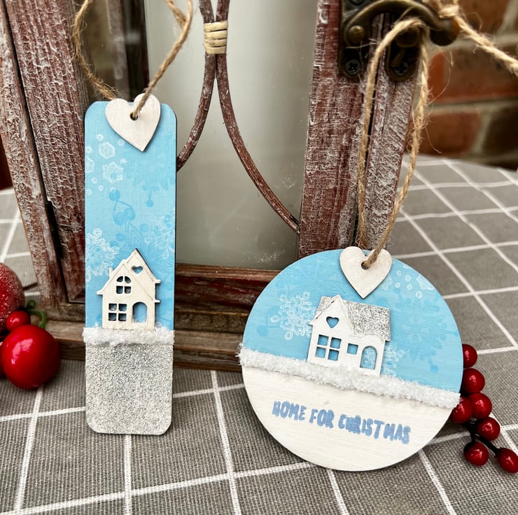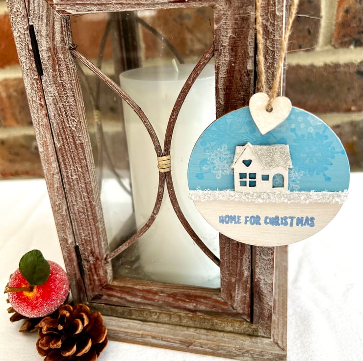 'Home for Christmas with glitter ’ Wooden Decoration & Bookmark set. Handmade round Christmas decoration for use on tree, door, candle stick etc approximately 8x8cm. The wooden bookmark is appropriately 12x3cm in size and can also be used as a decorative item.