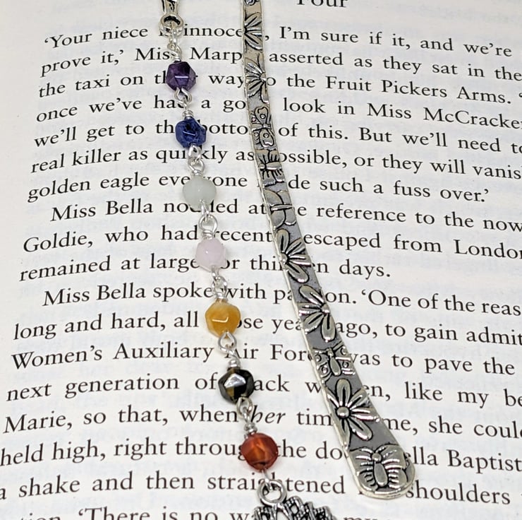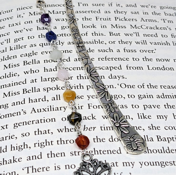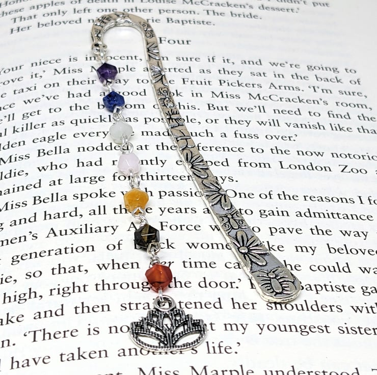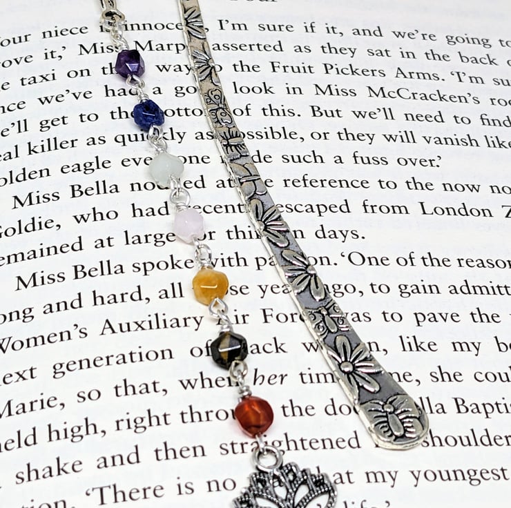 This pretty bookmark has a drop made up of seven different gemstone beads, one related to each of the seven chakras.