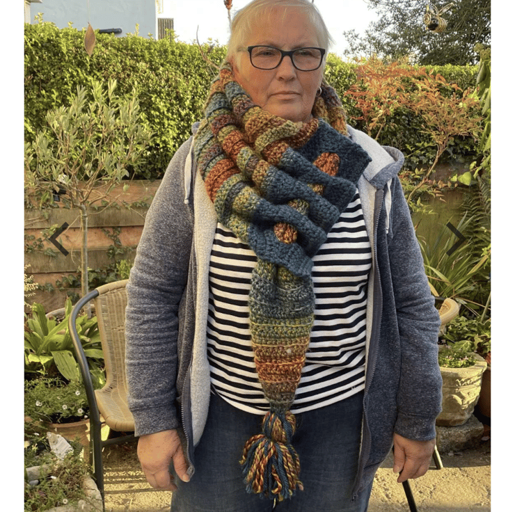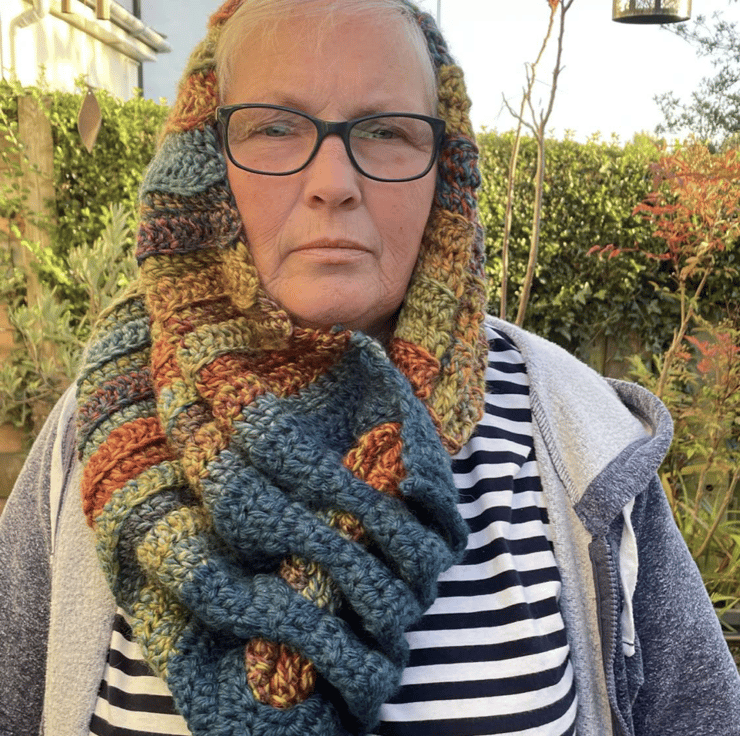 Guaranteed to keep you snug and warm this beautiful item (modelled by mum who honestly really was happy about modelling despite the lack of smile) can be worn as a scarf or a snood. Crocheted in autumnal tones of acrylic mix yarn, it can be machine washed at 30 degrees but recommend leaving to dry flat naturally.