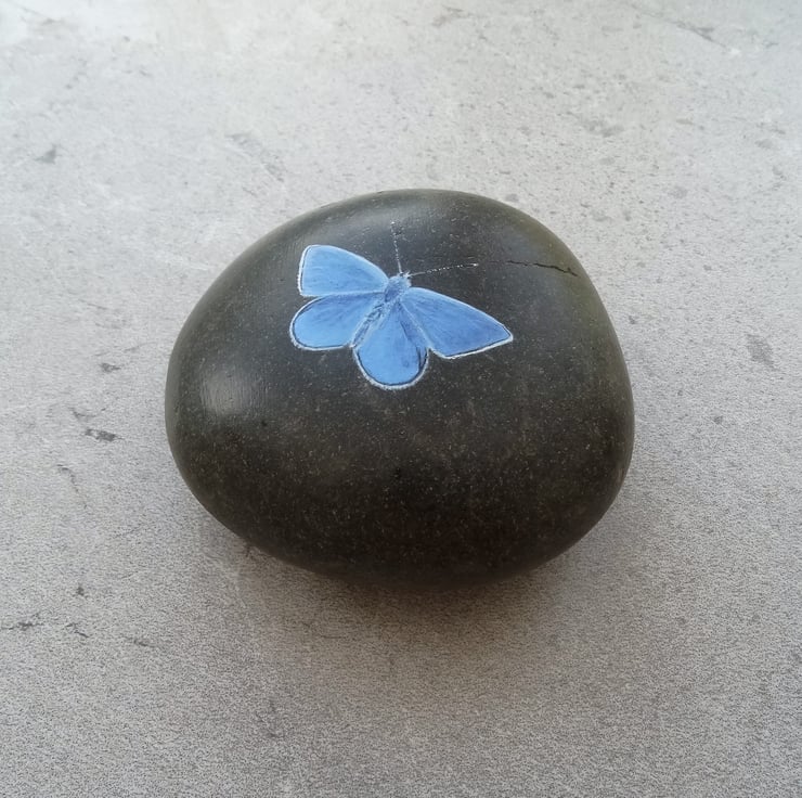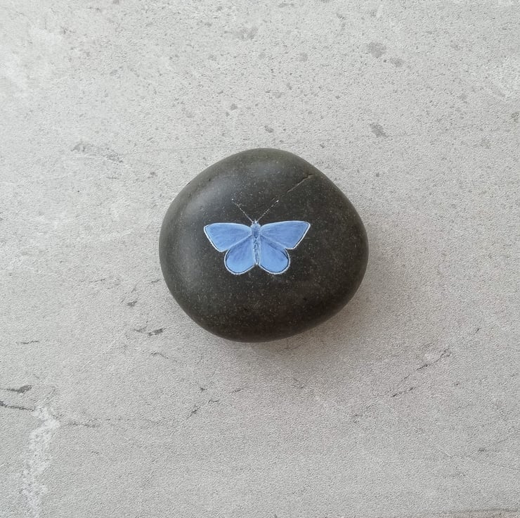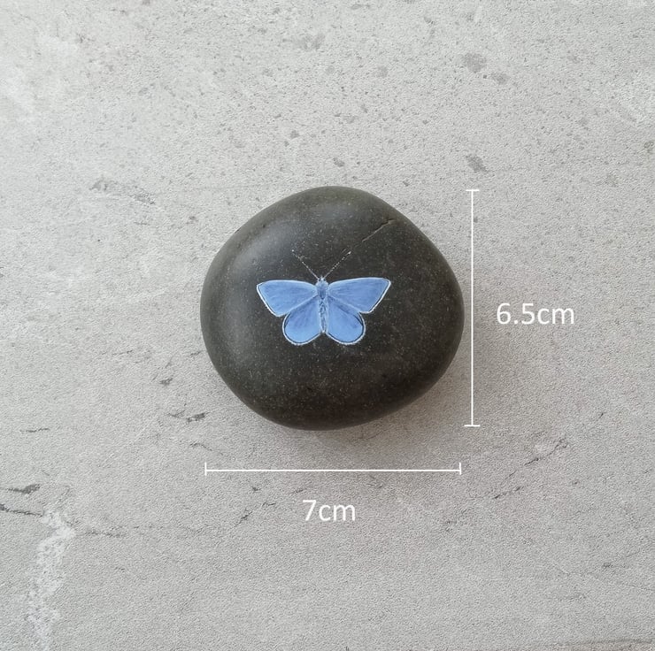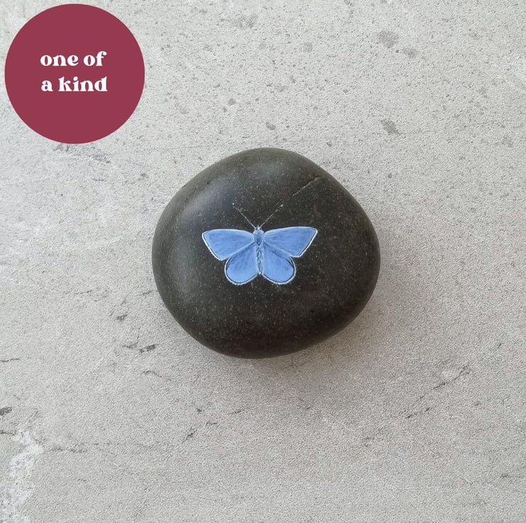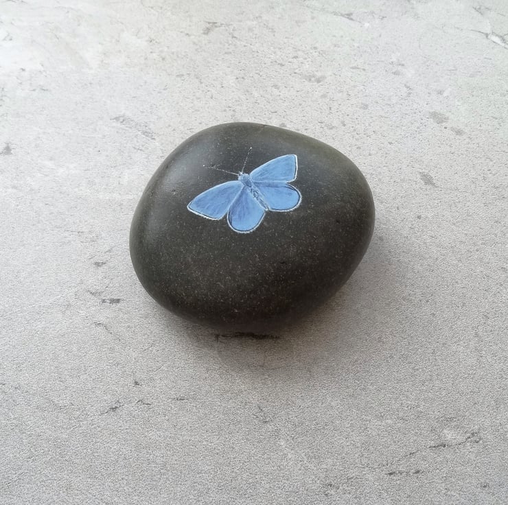 My latest Common Blue butterfly stone has been hand painted in quality acrylic paints and finished with three coats of acrylic sealer which gives them a smooth tactile finish.