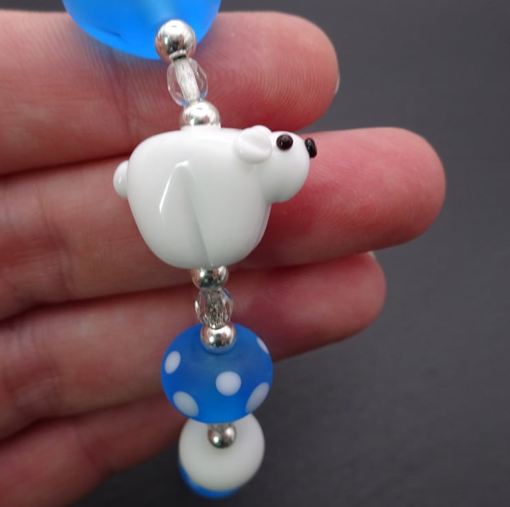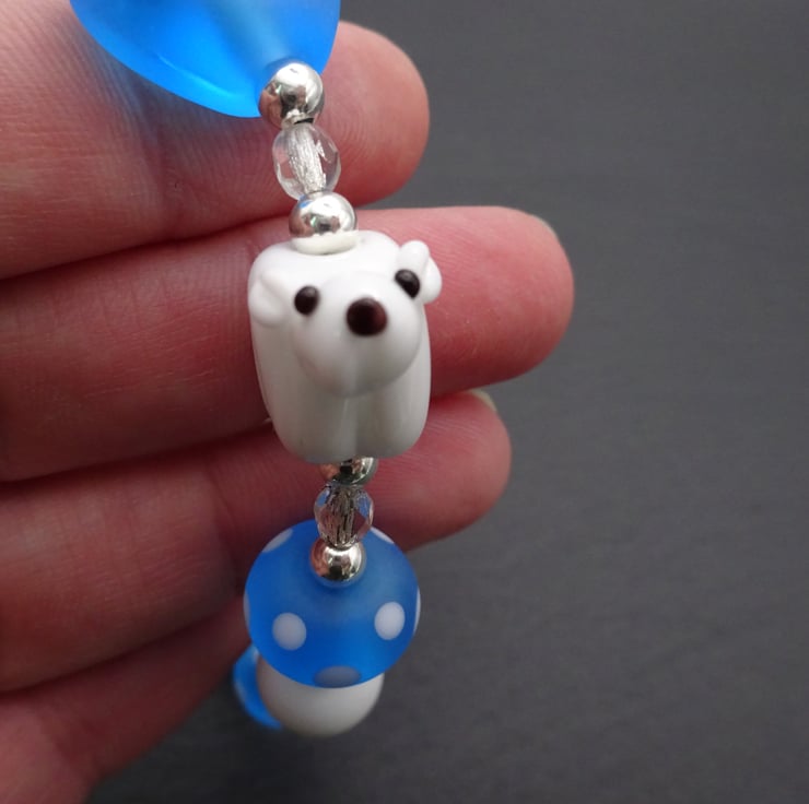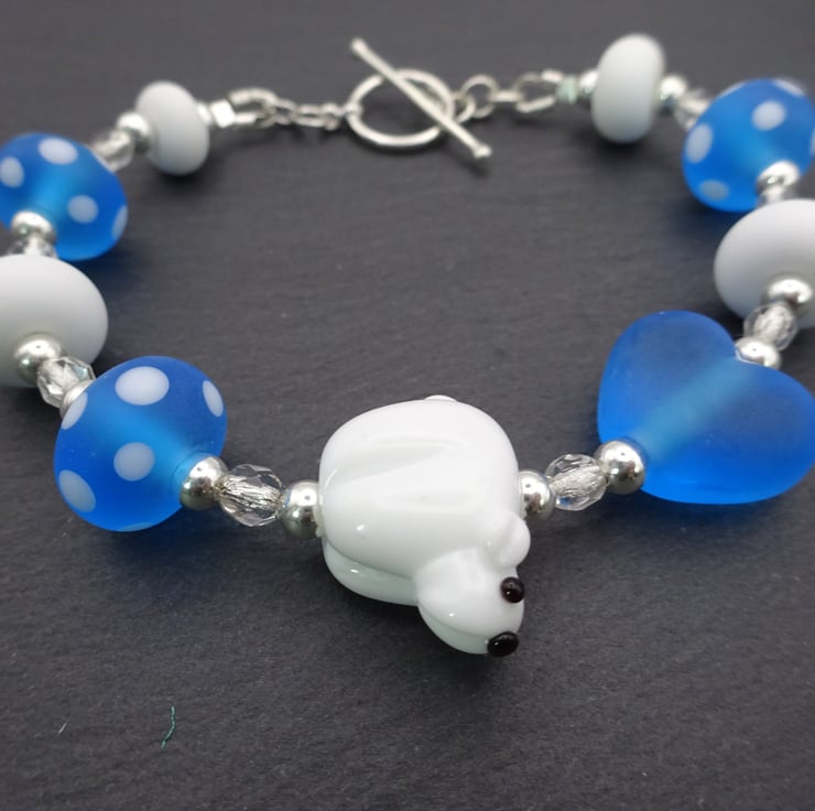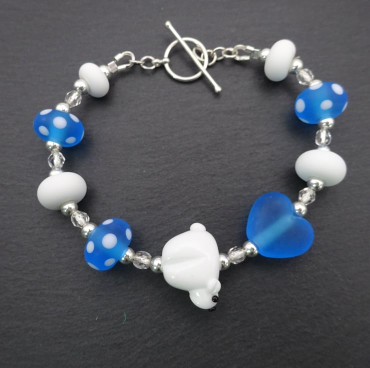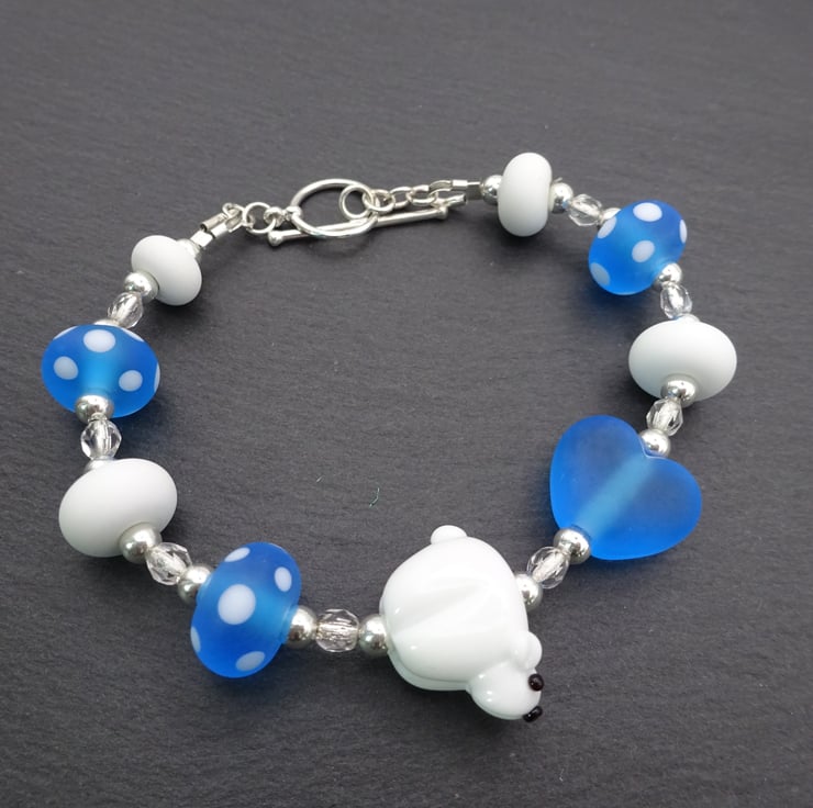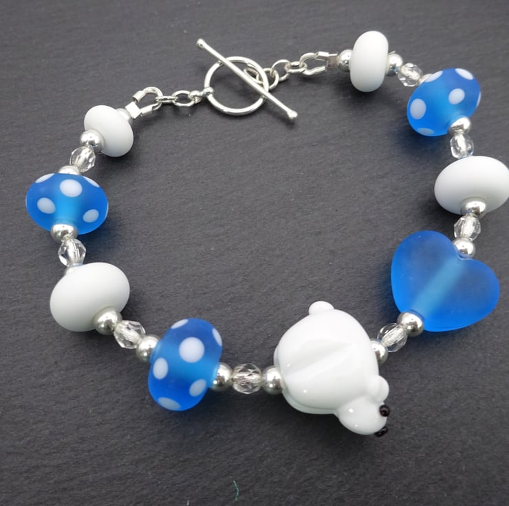 A bracelet made with handmade lampwork glass beads, The beads have been handmade by me using blue and white glass and also features a cute little polar bear focal bead.