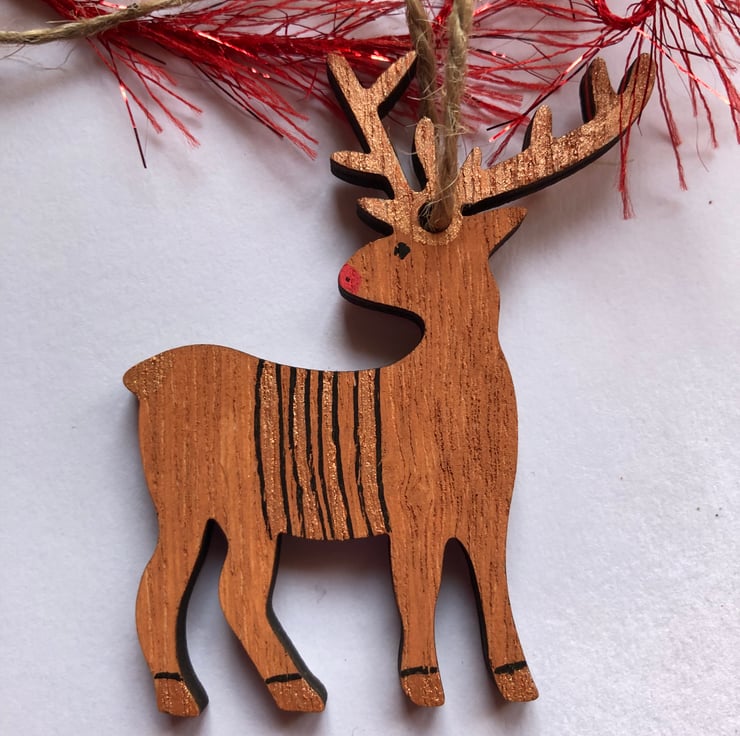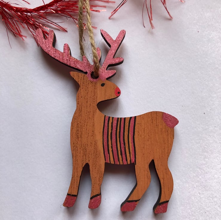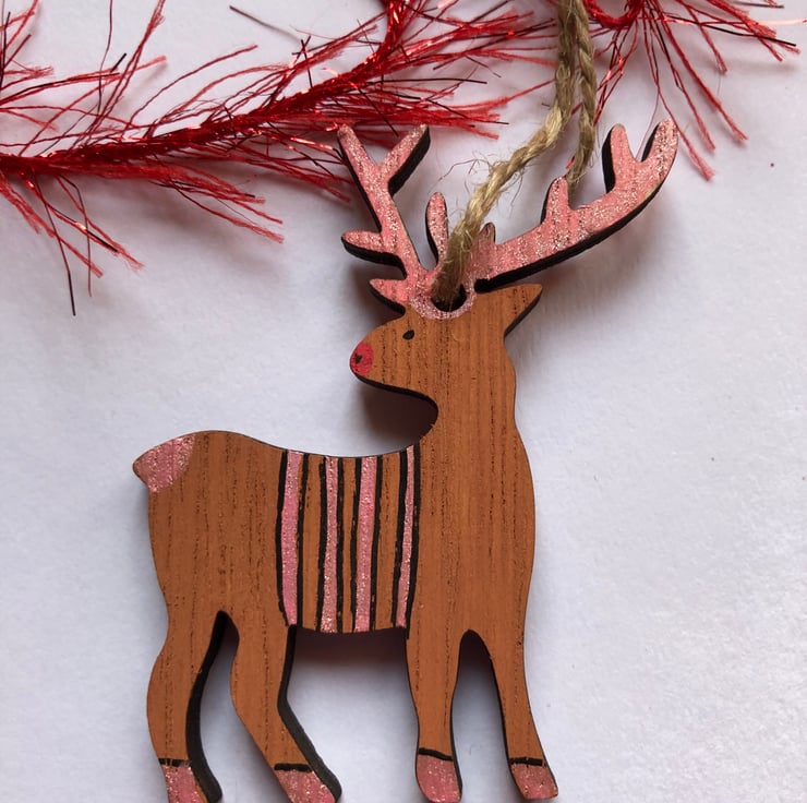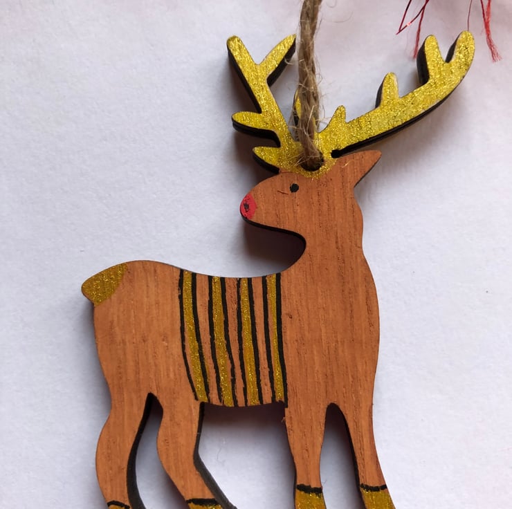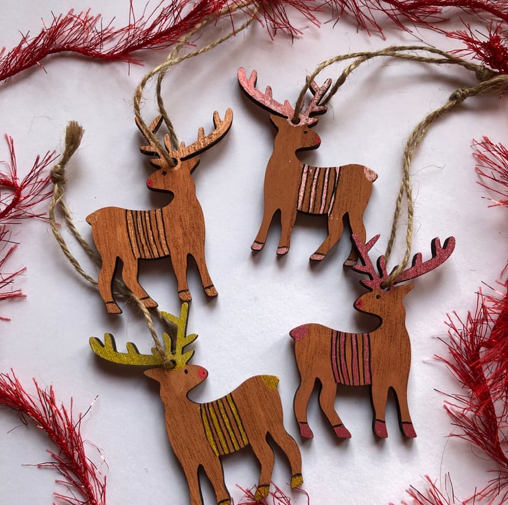 4 hand painted wooden Christmas tree decorations with jute string to hang them up on your tree. Why not attach them to a Christmas gift?